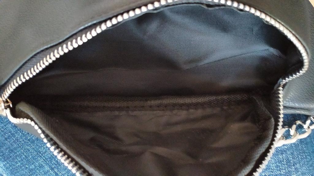Сумочка простая, без изысков, кроме серебрянных цепей. Ремень регулируется. Запах сильный :(. Молния закрывается/открывается легко. Внутри ткань типа плащевки. Внутри карманов нет. Из-за цепей тяжеловата (металические). В целом цена-качество нормально :)