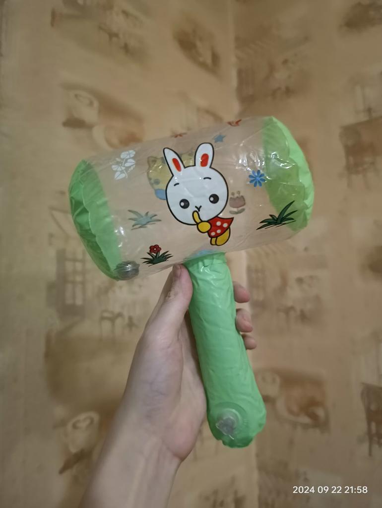 Ещё один молоточек надувной) Прошлый порвался(( Дочка его очень полюбила, по этому заказали второй раз. Цвет приходит рандомно. В прошлый раз пришёл синий. В этот раз зелёный и с браком. Дырка и сдувается разумеется... Заклеила скотчем, чтоб хоть намного прослужил... Брала за 49₽ В СП не стану обращаться, для возврата средств...