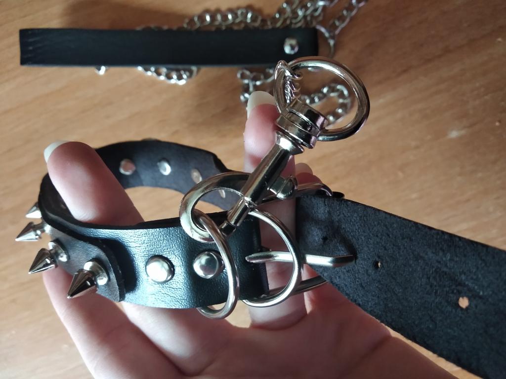 Пришёл ±за две недели, сделан хорошо, в процессе пересылки немного замялся с одной стороны и покрылся складками, но этого на шее не видно. Ремешок длинный: цепочка сама длиной 90см, ручка — 16см, карабин — 5,5см. Ошейник в целом около 41-45 см, имеет 5 отверстий для застёжки. Первая — на обхват шеи 29см, остальные (каждая на расстоянии 2см) — 31, 33, 35, 37. Держится хорошо, не натирает. Крепление для ремешка(по две полукруглые металлические детали с отверстием внутри) находится по обе стороны ошейника — спереди и сзади. Шипы скользят вокруг собственной оси, но можно подкрутить с помощью отвёртки(прикреплены, скорее всего, винтами). Материал — кожа. Снаружи покрыт лаком. Имеет приятный запах. Доставка бесплатная, отслеживалась на протяжении всего пути. Спасибо продавцу и джум!