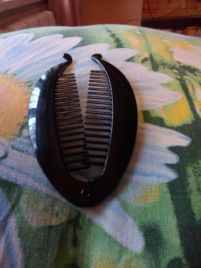 Заколка для волос " Банан ". цвет чёрный. Большая, мне не подошла. Эта заколка лучше для пористых волос,вьющихся. На прямых висит....не удобная и волосы выползают. К качеству претензий нет. Просто не для прямых и тяжёлых волос. Заказывала 29 августа, пришла 4 октября.