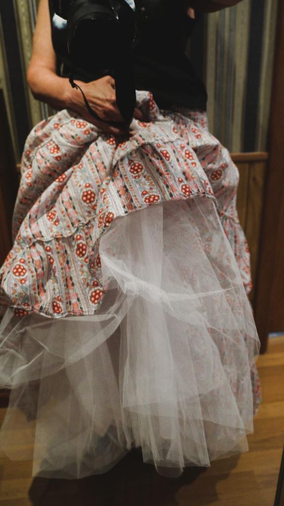 С нижними юбками у меня уже второй раз неудача: первая оказалась слишком пышная и короткая, а эта хороша по длине, но оборки, сшитые из жёсткой сетки, стоят «колом». Верхнюю сразу же срезала, вроде стало получше, т. к. материала на неё пошло 3,40м. Хорошо, что есть шнурок в поясе, не так критично иметь тонкую талию. Есть ещё идеи улучшить юбку, позже добавлю фотографии. У чёрной юбки оборка начинается сразу от талии (в рекламе этого не разглядеть).