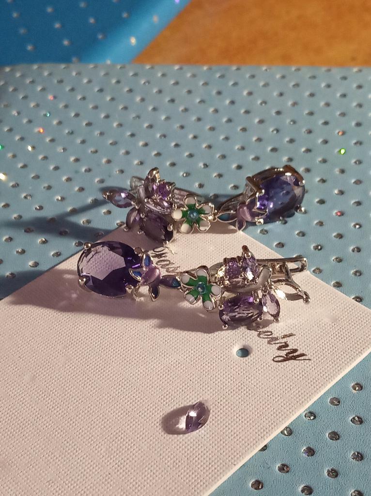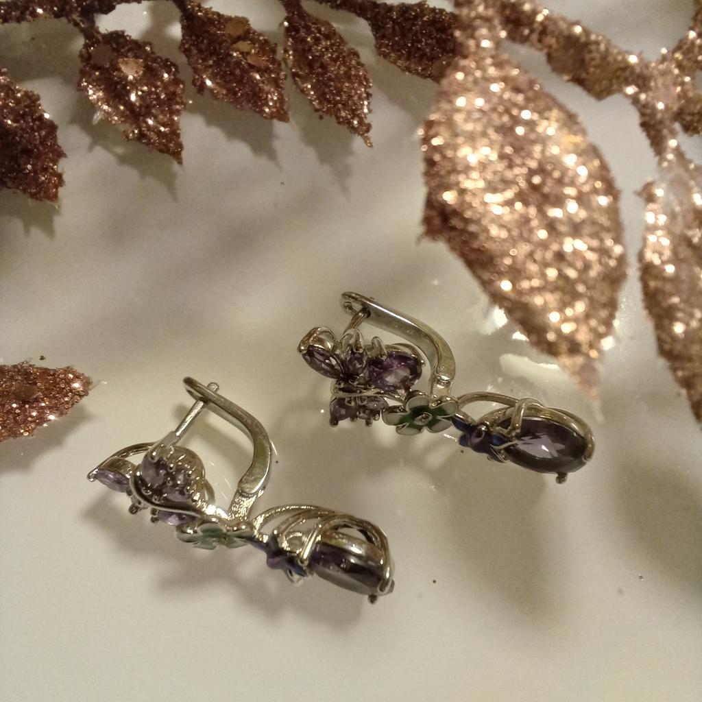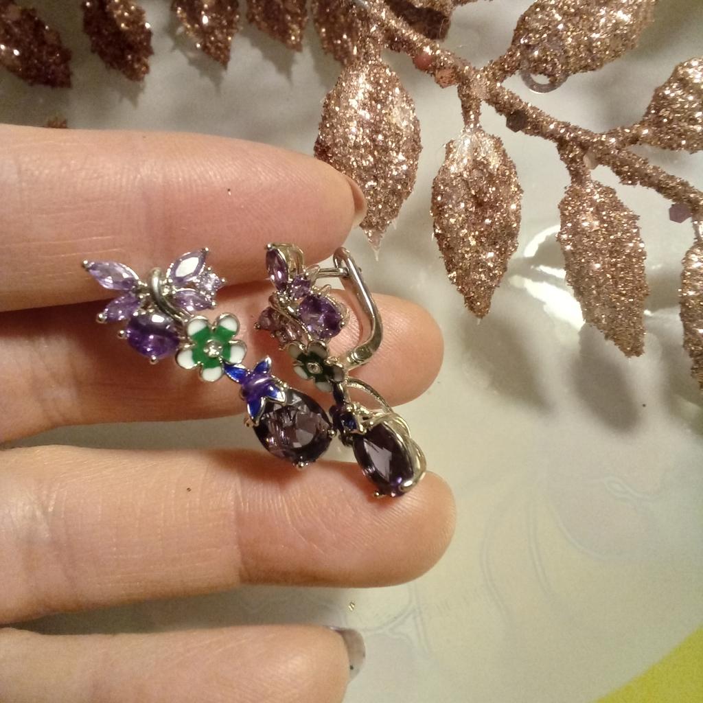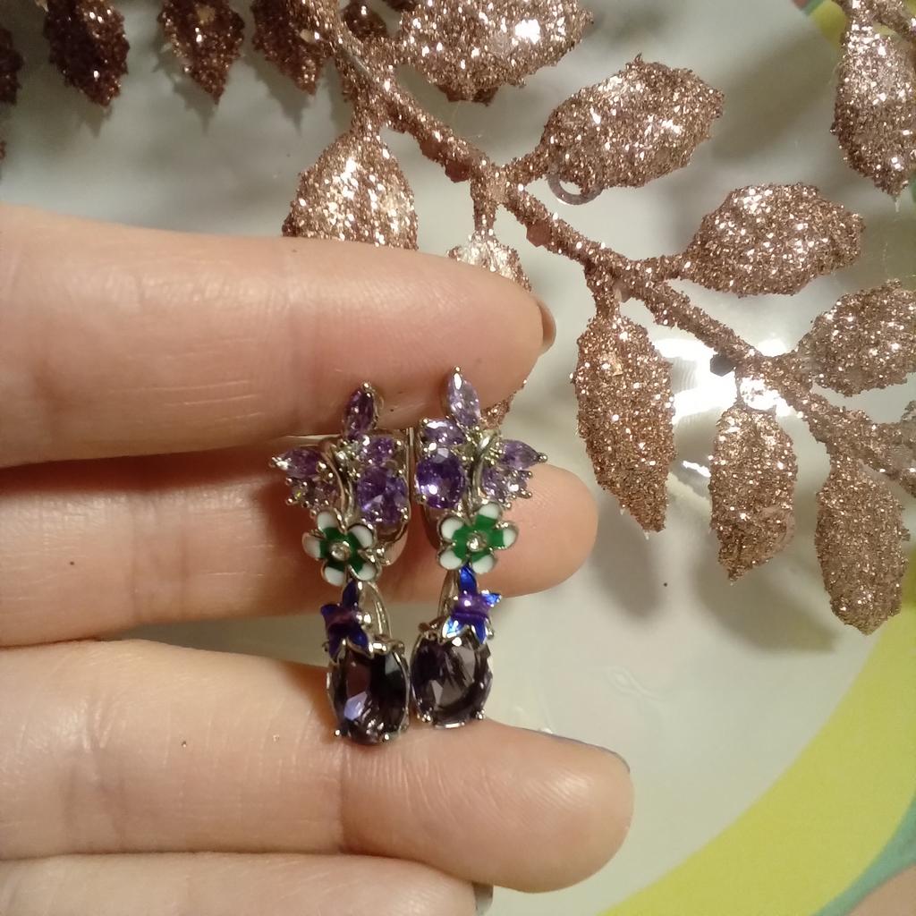 🌟💧🔥🌟🔥💧🌟Серёжечки внешне Ооочень красивые: в серебряном обрамлении шикарные прозрачные сиреневые и белые камни из стекла💎🗯💦, самый крупный сиреневый камень на подвижной подвеске и украшен фигуркой эмалированной бабочки🦋. Выполнено всё аккуратненько, изящно👍🏻👍🏻👍🏻👏🏻.Серьги действительно выглядят изысканно и элегантно. Были бы у меня они комплектом к известному перстню🙄🤤🥰🤗 Но❗❗❗Абсолютно не рабочие застёжки попались на обеих серьгах🥺😞.Защёлки болтаются во все стороны, не поджать их никак😠.Штыречек легко, даже без усилий гнётся как угодно😱😬Что это за металл такой как пластилин🤨🤔? Носить это изделие как серьги НЕ ВОЗМОЖНО вообще, у меня даже померять еле получилось🤫🤭. 🌺❄🌺❄🌺Спасибо большое СП! Стекляшечки мне подарены🥳🎊🎉🎈. Придётся думать🤔, куда и как использовать эту красоту. Всем: только радости от Ваших покупочек💃🎶🤸♀️🎷🕺🎉🤸♂️🥳, для печали не искать причин😉🌞😋🥰😘🌹🌹🌹😘