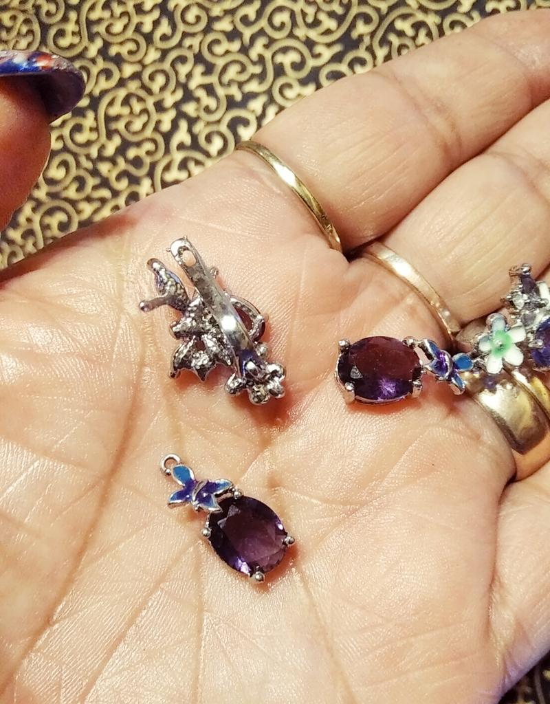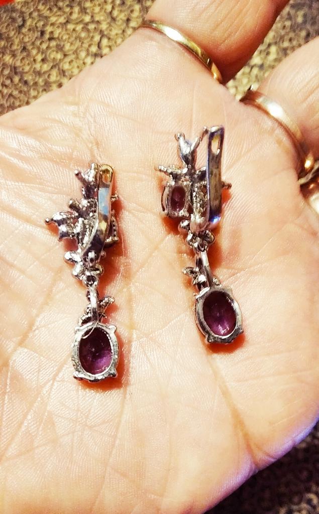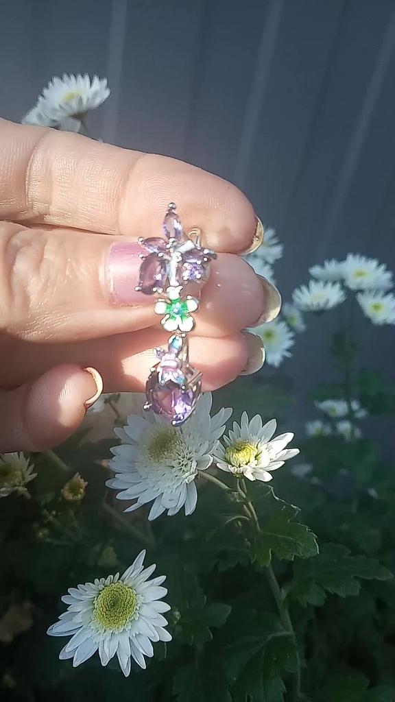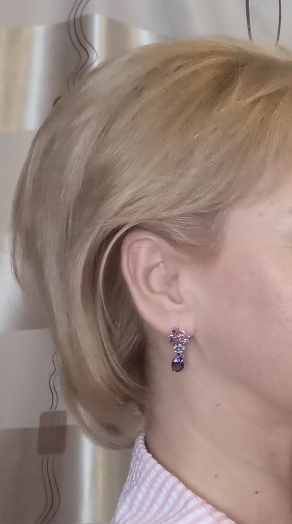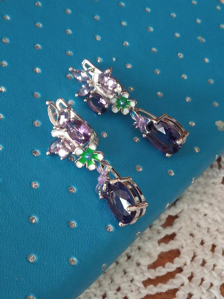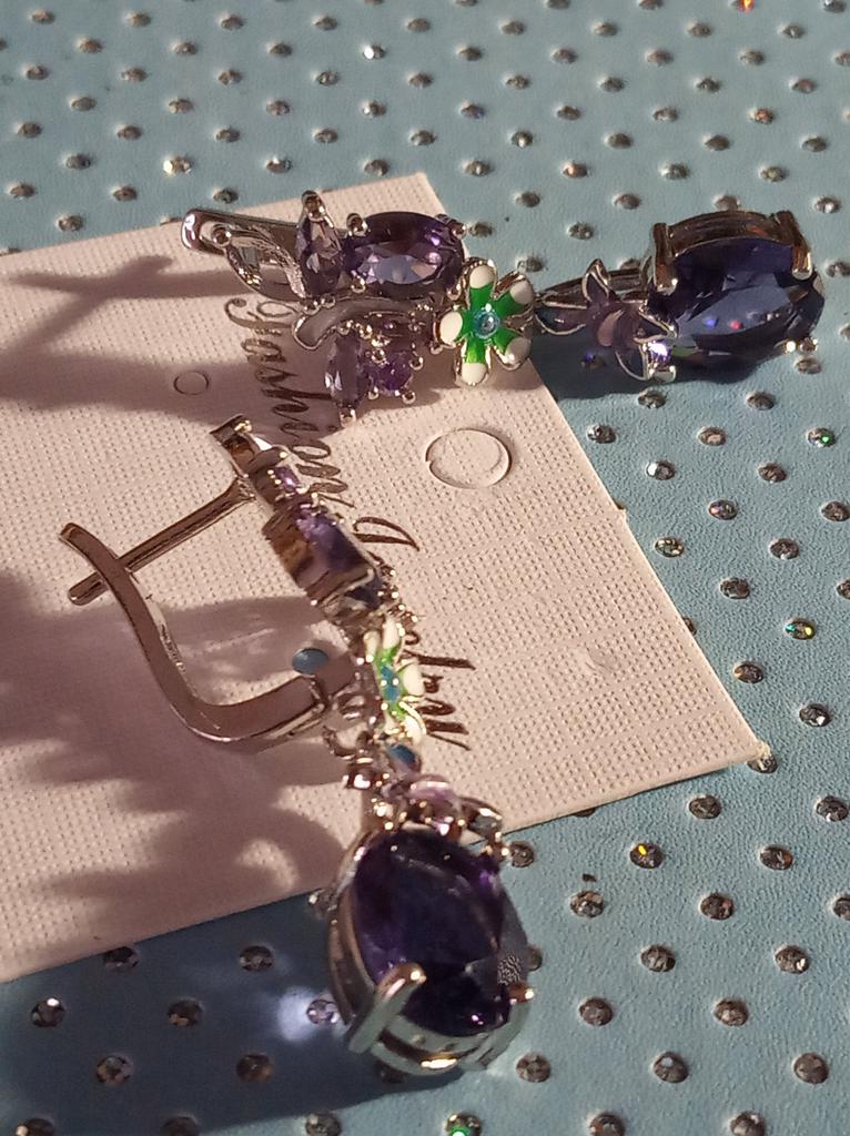 🌟💧🔥🌟🔥💧🌟Серёжечки внешне Ооочень красивые: в серебряном обрамлении шикарные прозрачные сиреневые и белые камни из стекла💎🗯💦, самый крупный сиреневый камень на подвижной подвеске и украшен фигуркой эмалированной бабочки🦋. Выполнено всё аккуратненько, изящно👍🏻👍🏻👍🏻👏🏻.Серьги действительно выглядят изысканно и элегантно. Были бы у меня они комплектом к известному перстню🙄🤤🥰🤗 Но❗❗❗Абсолютно не рабочие застёжки попались на обеих серьгах🥺😞.Защёлки болтаются во все стороны, не поджать их никак😠.Штыречек легко, даже без усилий гнётся как угодно😱😬Что это за металл такой как пластилин🤨🤔? Носить это изделие как серьги НЕ ВОЗМОЖНО вообще, у меня даже померять еле получилось🤫🤭. 🌺❄🌺❄🌺Спасибо большое СП! Стекляшечки мне подарены🥳🎊🎉🎈. Придётся думать🤔, куда и как использовать эту красоту. Всем: только радости от Ваших покупочек💃🎶🤸♀️🎷🕺🎉🤸♂️🥳, для печали не искать причин😉🌞😋🥰😘🌹🌹🌹😘