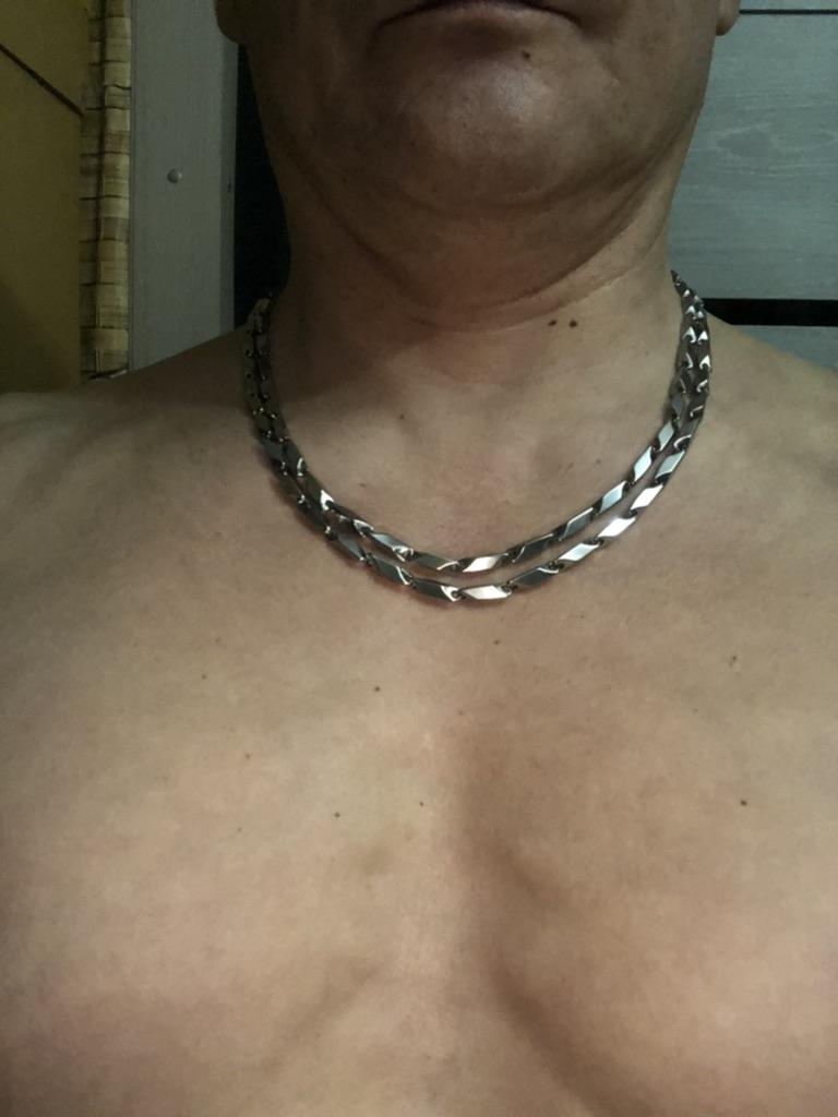 Повторная покупка. Так понравилась первая, что решила взять вторую, тем более, что на первую уже глаз положил супруг. Полная длина цепочки (вместе с замочной системой) всего 54 см. Для меня это не критично
