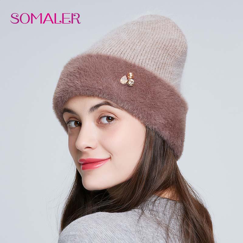 Зимняя вязаная шапка для женщин Премиум-шапка из меха кролика рекс Русская женская повседневная шапка со стразами
