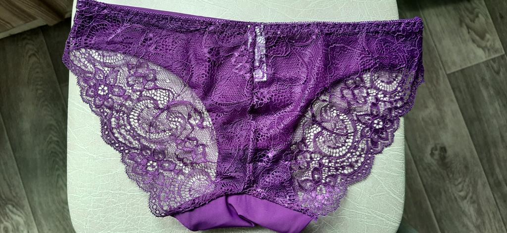 Трусики пришли за месяц до Кемеровской области, в целости-сохранности. Кружево приятное, есть ластовица, по качеству устраивает. На бедра 94 заказала L,как раз! Фиолетовый цвет на самом деле ярче, чем на фото. Покупкой довольна, буду заказывать еще