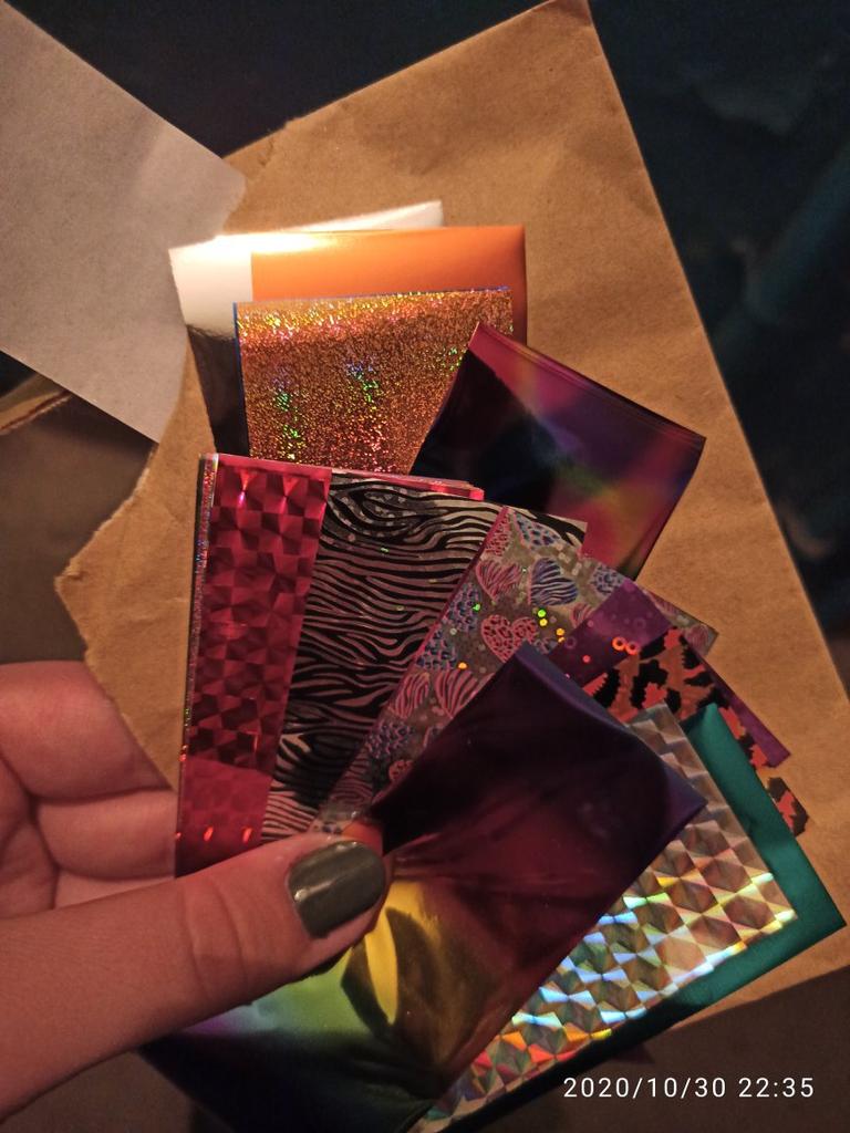 Доставка до Красноярска почти 3 месяца. Упаковка не повреждена. Купила за 153 руб. 24 листа голографической лазерной фольги. Ну очень красивая, очень тонкая легко перенесла и получилась как хотела хотя делала первый раз в жизни. Очень понравился результат и качество товара. Длина полоски 10 см. К покупке могу рекомендовать не смотря на цены товар стоящий, да ещё и клей во время получила, эту фольгу взяла для себя С уважением Лариса