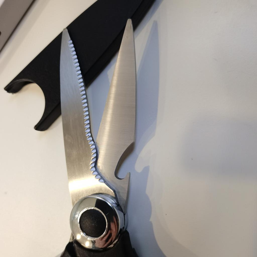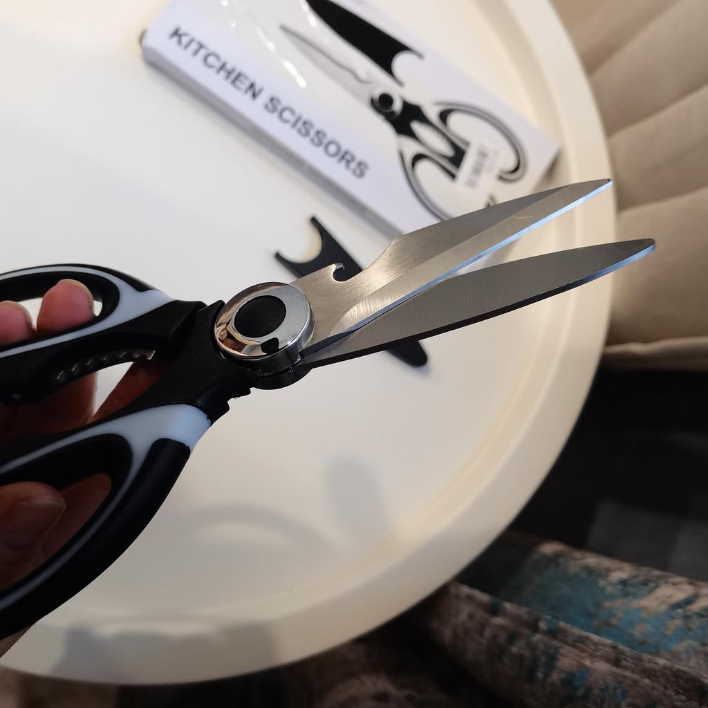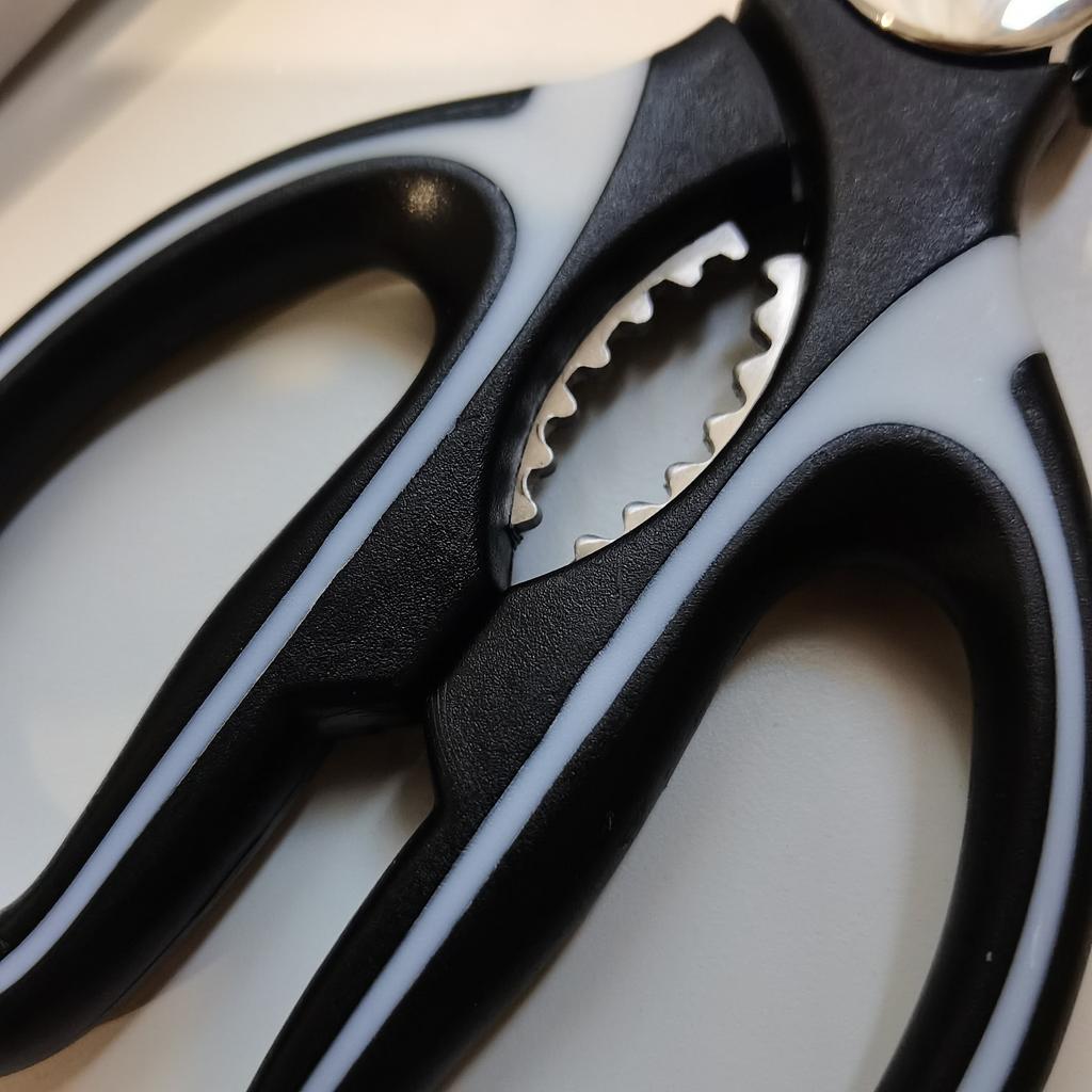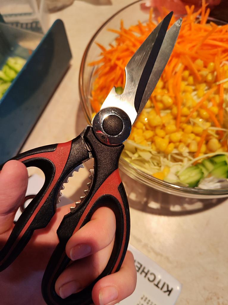 Многофункциональные ножниц. Очень довольна покупкой, впервые их опробовала на овощах, но на данный момент резала уже и мясо и рыбу 👍. ✂️Выполнены из прочной стали, ими легко открывать упаковки, разделывать рыбу, мясо и птицу и не бояться того, что ножницы сломаются. ✂️Мелкие зубчики на лезвиях необходимы для удержания скользких предметов: сырое мясо или рыба, продукты в полиэтиленовых пакетах. ✂️Ножницы оснащены у основания лезвий специальной выемкой – ключом для открывания бутылок и банок с железными крышками. ✂️Пространство между ручками можно применять для колки орехов. ✂️ Пластиковый чехол защитит от влаги и пыли. Отличная покупка, пользуюсь ежедневно. Очень удобные и острые, брать можно. Обнимаю 🤗 #Ксю !