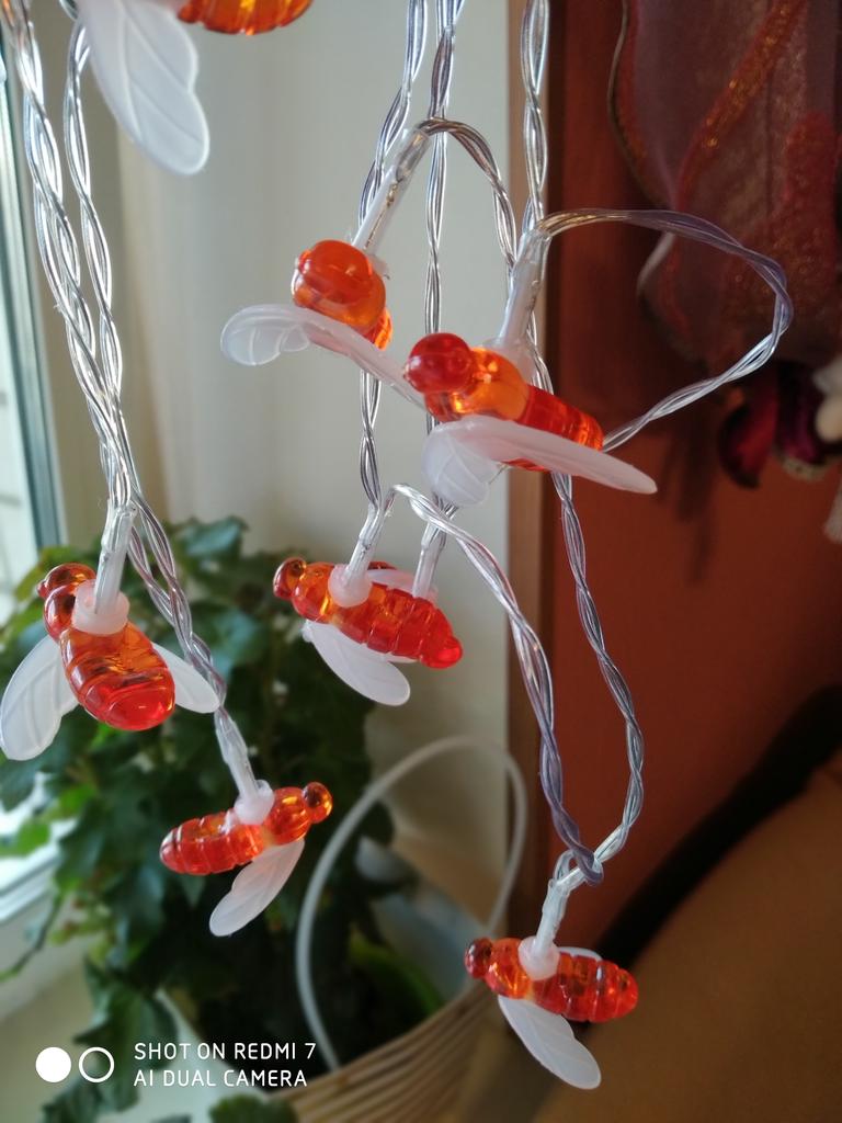 7️⃣6️⃣7️⃣ Гирлянда Гирлянда, которая украшена 10 пчелками. Но мне эти пчелки напоминают не пчел, а больших мух. Мне даже дочка сказала, что мама нет, это не пчелы, это мухи. Гирлянда дает очень тёплый яркий желтый свет, в связи с тем, что подсвечиваются оранжевые тела пчел. Работает гирлянда от двух пальчиковых батареек, в комплект не входят. Гирлянда никакая не новогодняя, не зимняя. Я брала для летнего уюта, так как пчелки это летняя тема)) Всем хороших покупок 🛒 🛒 🛒 🛒