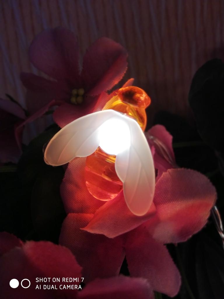 Светодиодная гирлянда в виде пчел. Гирлянда работает от двух пальчиковых батареек ( в комплект не входят) Длина гирлянды-1,5 м, 10 пчел Размер пчелы 3,5*3,5*1 см Цвет освещения- теплый белый Материал- ПВХ Проста в использовании, есть кнопка управления для включения и выключения питания. Гирлянда подойдет для украшения и декорирования помещений, а также открытого пространства, например, сада, для торжественных мероприятий и конечно же новогодних праздников. Качество отличное, пчелки аккуратненькие. Доставка в течении пяти недель, упаковка хорошая, продавцу спасибо.
