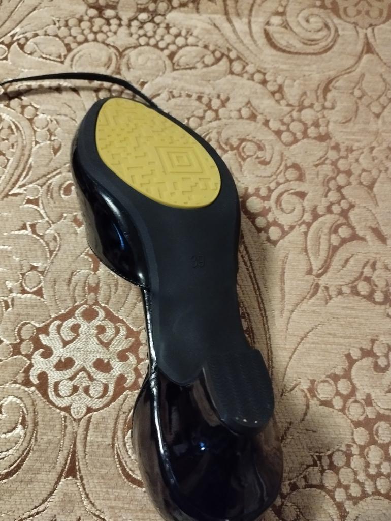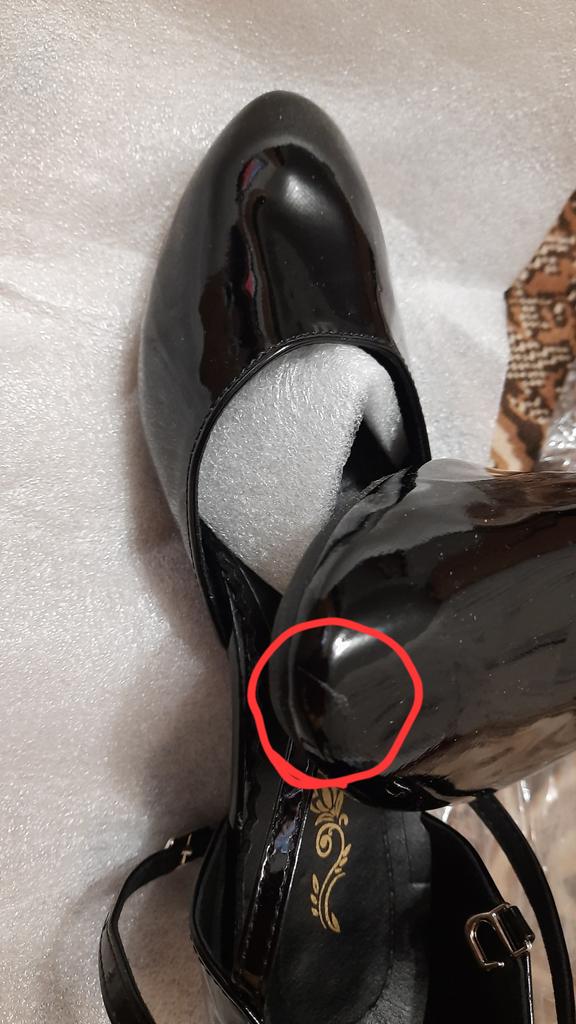 В целом,туфли не плохие,лакированные,в отличие от картинки.На одном из каблуке,при стыке с подошвой,явный брак в виде образовавшейся складки,причем снаружи и царапины на лаковой поверхности,которые не оттираются.Ну в общем,покупка-"кот в мешке",как повезет...мне не повезло...