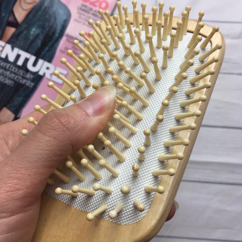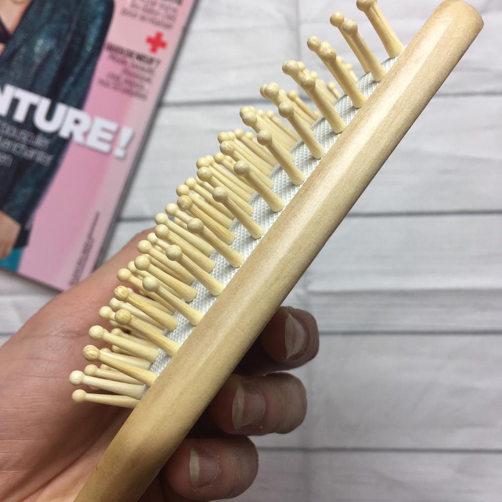 Шикарная щетка из дерева. Действительно похоже на то. Качество отличное. Резиновое основание с зубчиками мягкое. Благодаря этому отличный массаж голове. Зубчики тоже округлые приятно массируют. Расположены не жидко. Но есть один минус. Они как бы расширяются в основания резины и уже в самой резине сужаются резко. Из-за этого цепляют волосы. Так что если шевелюра густая и пышная вероятно будет цеплять. У меня объема нет , я рассчитываю и массаж руб спокойно.