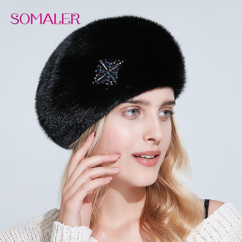 SOMALER береты из норки для женщин зимние русские шапки из цельного меха норки женские модные шапки со стразами — купить товар онлайн с бесплатной доставкой по всему миру!