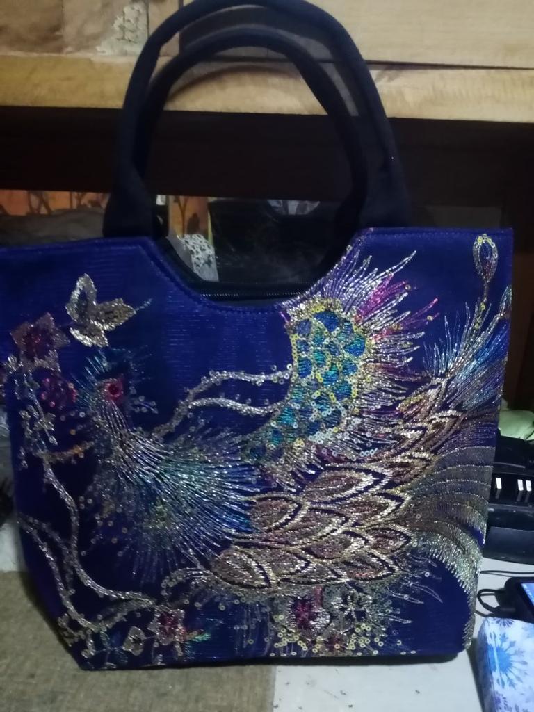 Здравствуйте, получила сумочку из текстиля с вышитым пайетками павлином. Мне понравилась, очень красивая вышивка люрексовыми нитками и золотистыми пайетками. Вышивка с обеих сторон сумки, она небольшая, на фото для масштаба положила ручку, а то кажется гораздо больше, как на фото продавца. Ручки, на мой взгляд, грубоваты, из плотной ленты, как на спортивных или богажных сумках. Для такой изящной, чисто дамской сумочки, по моему надо было ручки сделать поаккуратней. И внутри очень глубоко вшита молния, попыталась показать это на фото, прямо по середине высоты сумки и внутри под закрытой молнией остаётся объем, примерно, как в косметичке. Но общее впечатление прекрасное. Яркая, необычная летняя сумочка, думаю буду пользоваться с удовольствием. Купила за 599 рублейю доставка до Свердловской области ровно 2 месяца. Покупайте, Не пожалеете.