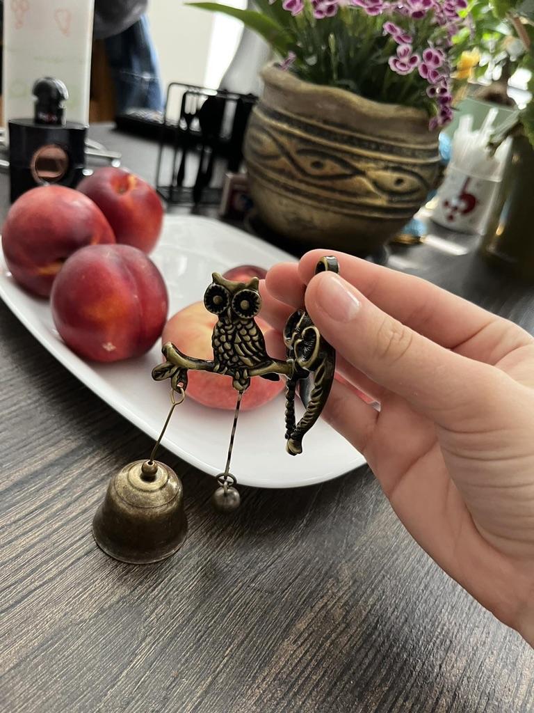 Винтажный колокольчик на дверь (слоник) НО...Заказывала СОВУ! Перепутали товар. Немного неприятно когда ожидания неоправдываются. В целом колокольчик понравился: Мелодичный звон Хороший магнит Можно просто подвесить на шуруп, гвоздик или крючок, т.к для этого предусмотрена петля. Получили товар без повреждения. Очень милая вещица... Попробую как-то решить вопрос о несоответствии полученного мной товара с заявленным в заказе. 7 июля 2022. Дополняю. Прошу прощения у продавца, т.к. забыла написать о том, что вопрос решили сразу. Спасибо Галине Галочкой, которая сегодня посоветовала обратиться в службу поддержки. Благодаря ей, я обнаружила свой ляп. А теперь у нас минизоопарк...и слоник, и сова. Наслаждаемся мелодичным звоном колокольчиков. От нас всем респект и успехов! 🌺