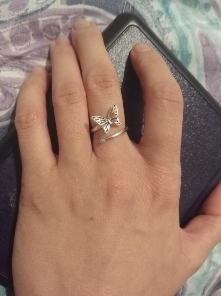 Прекрасное кольцо, которое подходит на все размеры. Бабочка смотрится нежно и необычно. Заказывала вместе с серьгами