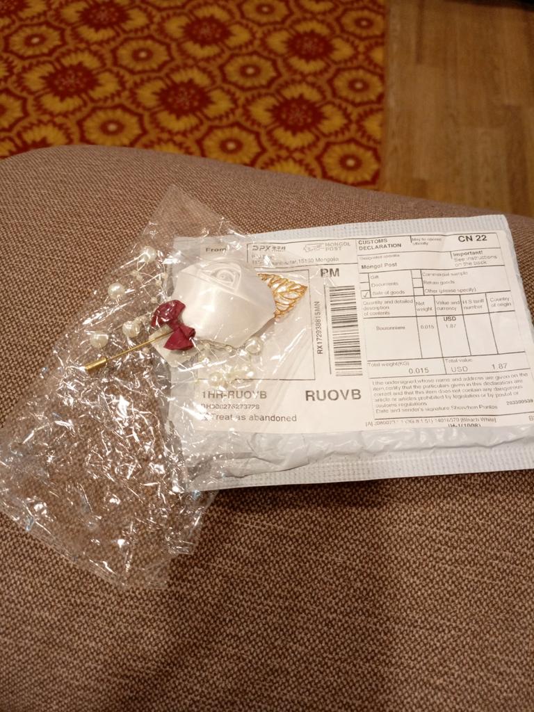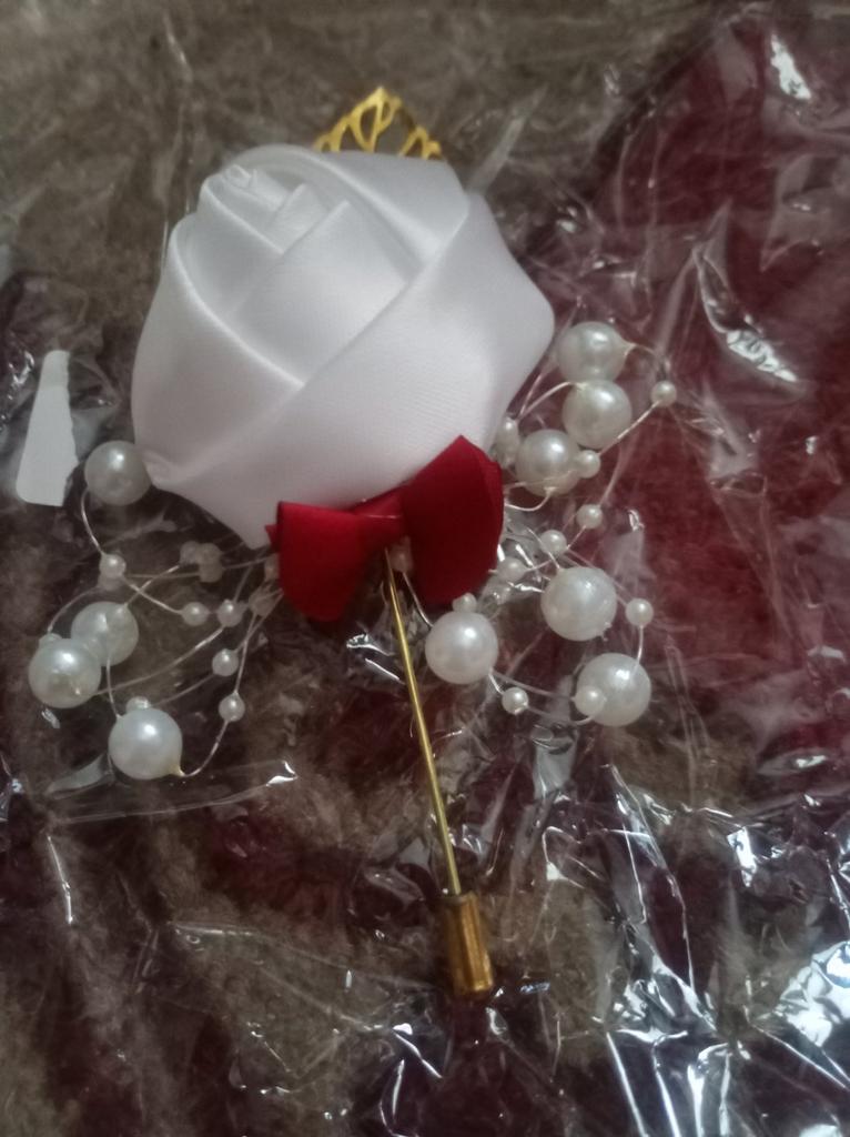 Бутоньерка симпатичная, покупала ее для украшения фетровой шапочки- шляпки. Единственно, что на рекламном фото цветок смотрелся, выглядел - скорее голубого цвета( у меня и шляпка голубого цвета), а в жизни оказался белым. Покрасила белый цветок в голубой цвет краской для шелка, получилось вполне гармонично.