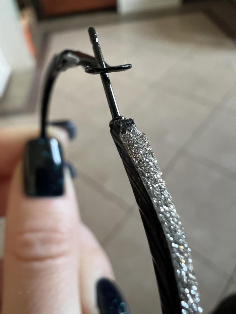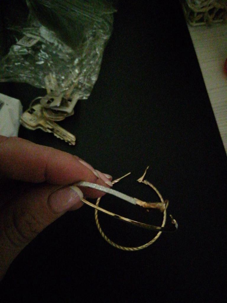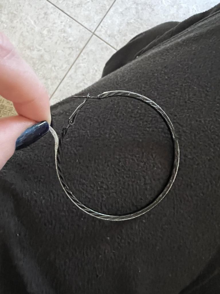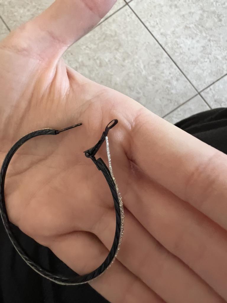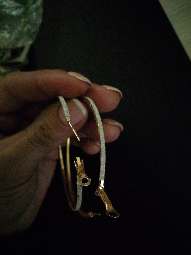 Это ужасно)))) Просто черное металлическое кольцо, оклеенное лентой с блестками 😂 Ну вы серьезно?!))) Я думала, они будут серебряного цвета с мелкозернистой гравировкой, а не это вот…Лента местами приклеена не ровно, у одной серьги так вообще с запасом оставили