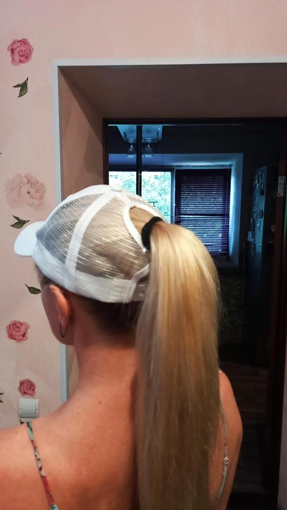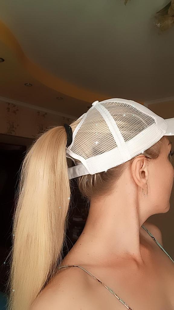 Кепочка выглядит как на картинке. Но размер большой. Убавила липучку максимально возможно, только тогда подошла мне по окружности головы, но стала топорщиться там, где отверстие для хвоста. Носить в таком виде невозможно, выглядит ужасно. В итоге деньги на ветер. И ещё мне не понравилось, что по окружности головы уплотнитель белый использован, его видно через сетку, это бросается в глаза.