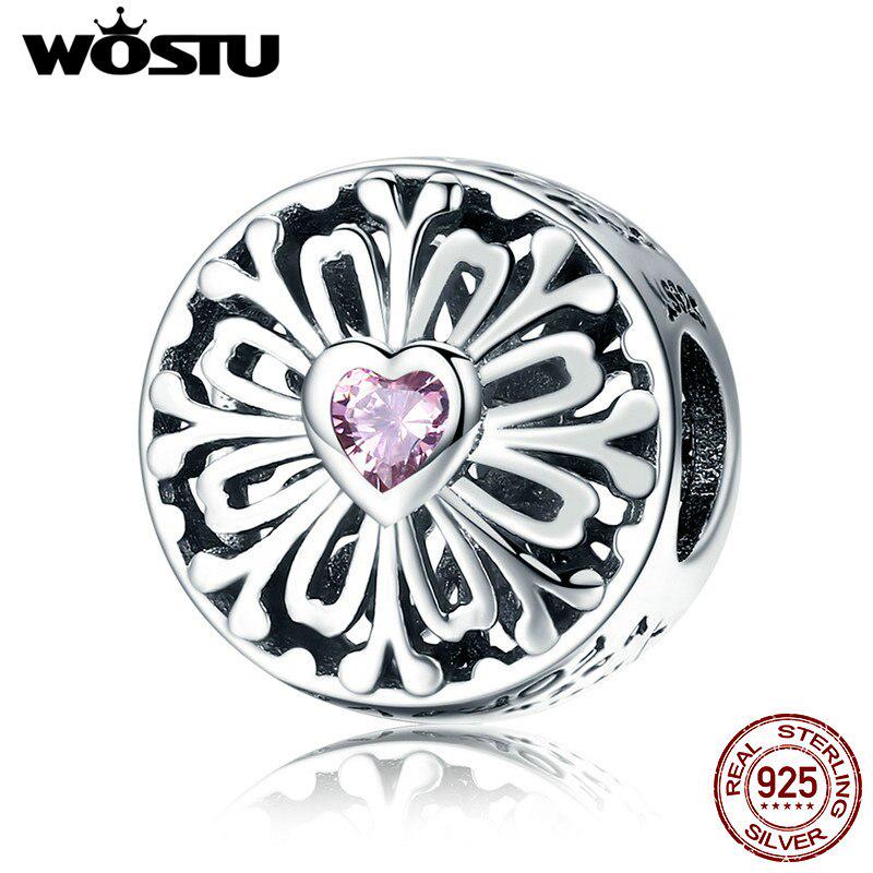 WOSTU 100% стерлингового серебра 925 пробы, розовое сердце, ажурные цветы, бусины, подходят для оригинального браслета-подвески «сделай сам»