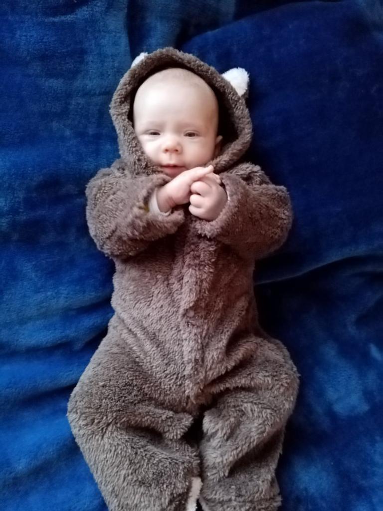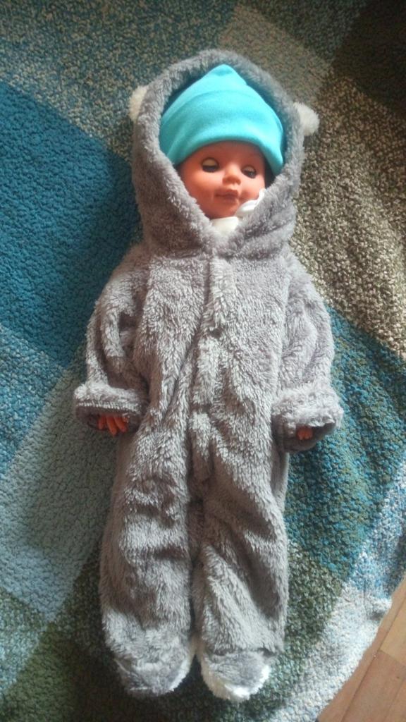 Действительно милый плюшевый, на пластиковых кнопочках, тонкая, мягкая, теплая синтетическия ткань с двусторонним ворсом. Очень приятный на ощупь и качественно сшит. На вшитой бирке маркировка 3-6М, но это не так. Максимум до 3-х месяцев, дальше будет мал. На фото кукла 60 см., ей впритык. Пришёл в объединённой посылке через месяц в П/О. Комбинезончик очень понравился, спасибо! Рекомендую к покупке, но брать нужно на размер больше, как минимум.