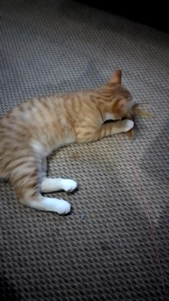 Перья, любимая забава. Кот готов играть круглосуточно. Это он устал, еле отдышался. Пёрышки пришли под цвет его шкурки. Есть карабинчик. Цепляется на палку дразнилку.