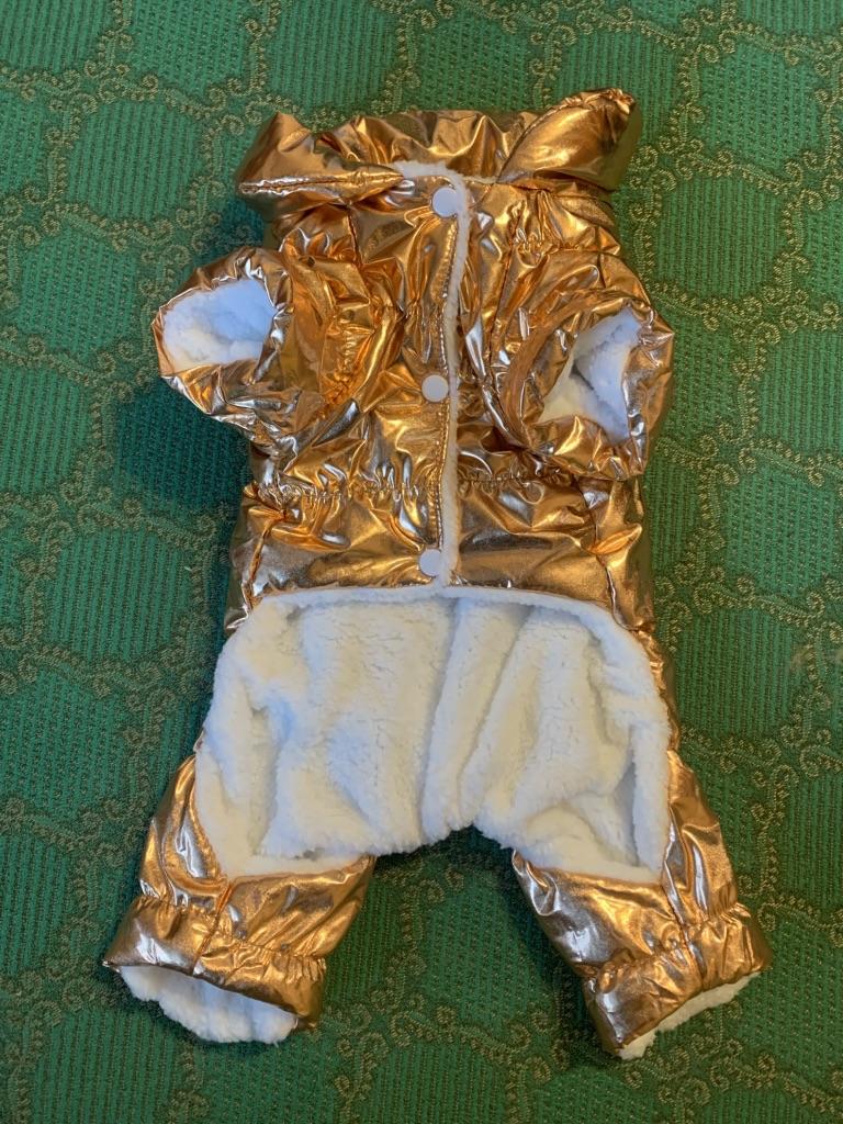 Ох, какой шикарный комбез!!! На фото он больше бронзовый, а в реальности золотой!! Моего пёсика даже назвали танцором диско на улице )))) комбинезон очень толстенький, поэтому учитывайте это при одевании шлейки, шлейка которая на псе болтается, на комбез еле застёгивается...