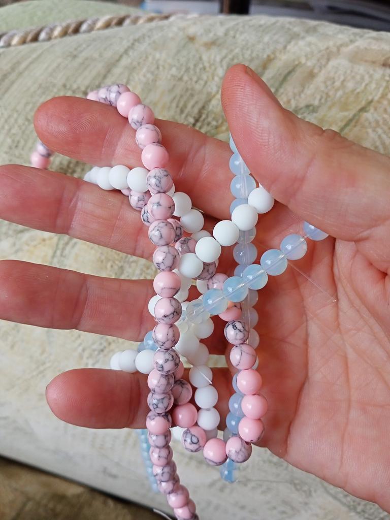 Камни приятного розового цвета с темным рисунком, похожи на говлит.Брала сразу 2 нитки, чтобы хватило на бусы с сережками.Количества бусин не считала, проверю, когда буду с ними работать .Визуально все бусинки целенькие, без из"яна, но если и есть, то это не критично., камень с пестрым рисунком. Брала за баллы. Товаром довольна продавца рекомендую.