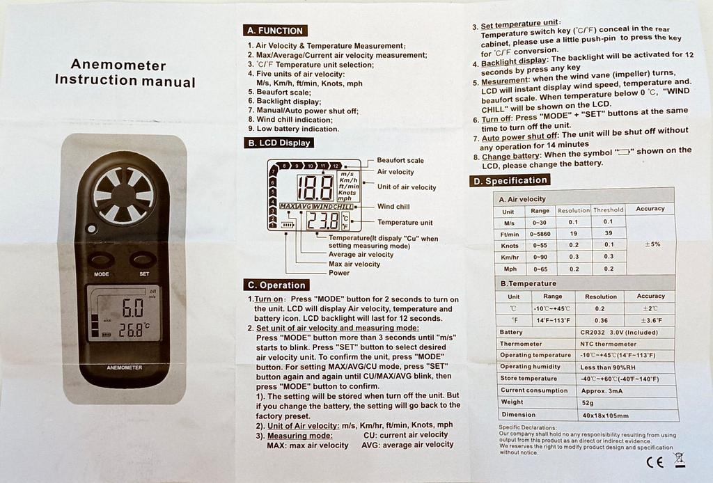 Анемометр работает хорошо.Брали мерять ветер.Все точно.Меряет как хочешь МЕТРЫ ФУТЫ БАЛЫ ..........Прибор нужный для корабля.Не забывайте купить дополнительные батарейки.