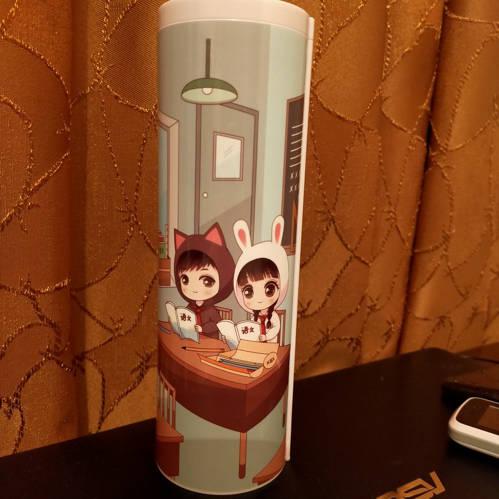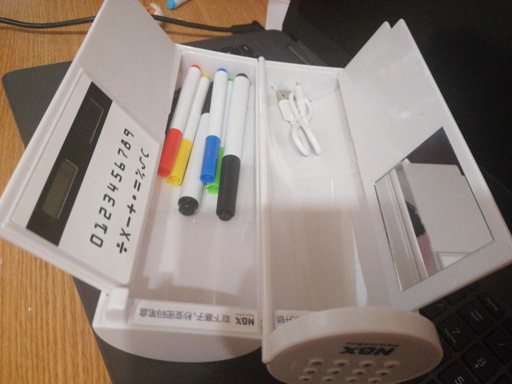 Пенал классный! Внутри зеркало, калькулятор, 4 цветных фломастера (зеленый, синий, желтый, красный) и 2 черных маркера, салфеточка для того, чтобы вытирать написаное маркерами, хорошо вытирает. Есть пару нюансов: ждали 2 месяца (но он того стоит) и красный фломастер не пишет (это не существенно). Очень хорошо упакован, в красивой коробочке. На подарок - супер!!! Рекомендую всем!