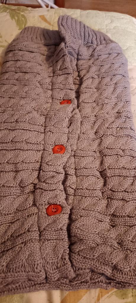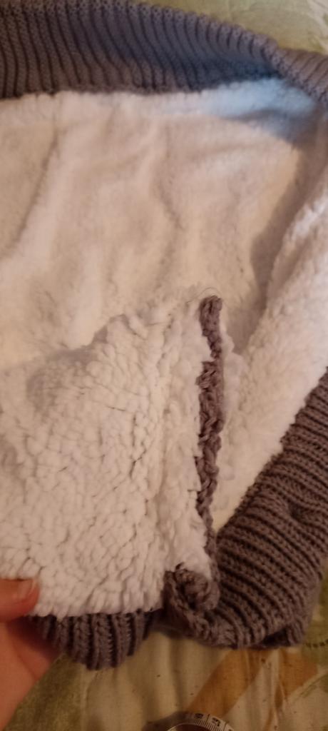 Я в полнейшем разочаровании! Вместо насыщенного красивого синего цвета , пришёл почти чёрный! Вязка рыхлая, растянутая! Как будто уже ношенный конверт. Между пуговицами тоже растянуто - будет задувать! Даже пуговицы совсем другие и этикеточки нет. Абсолютное несоответствие с рекламными фотографиями! Не стоит потраченных денег.