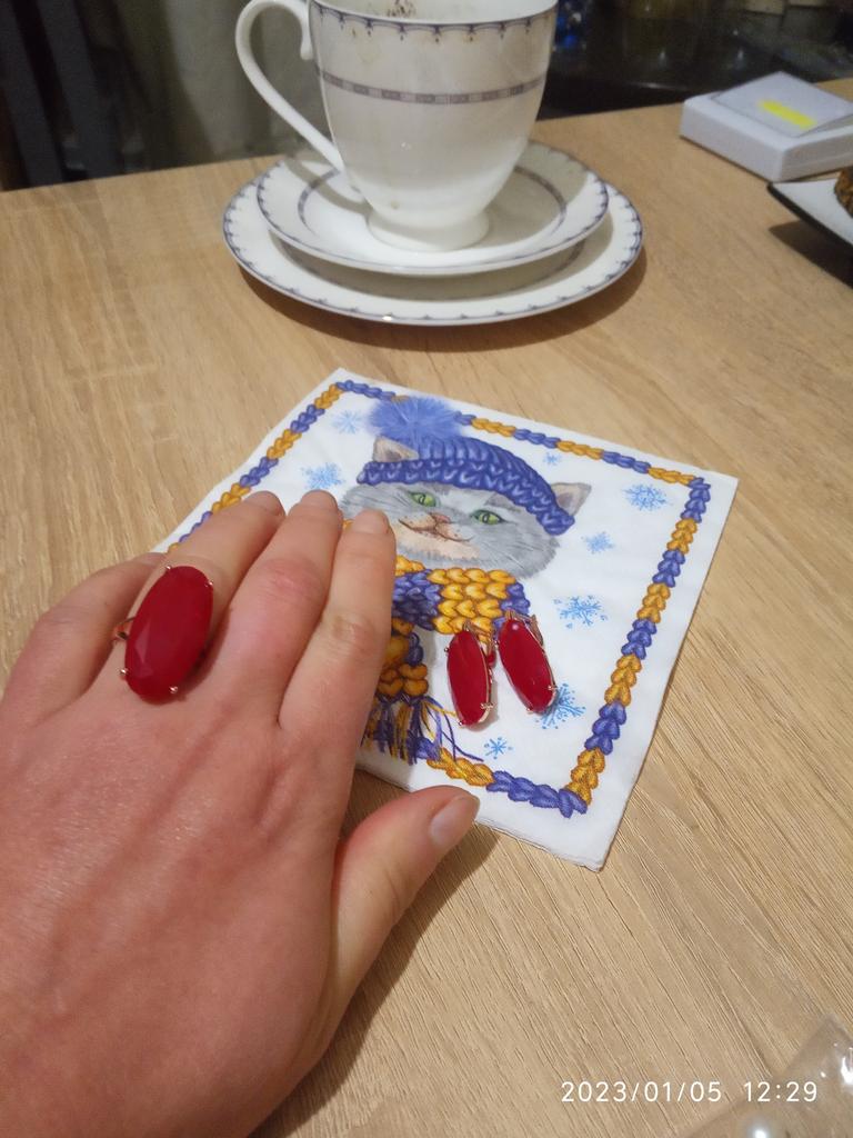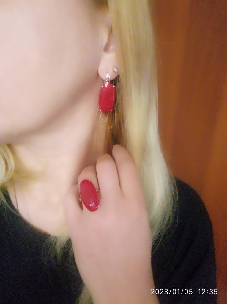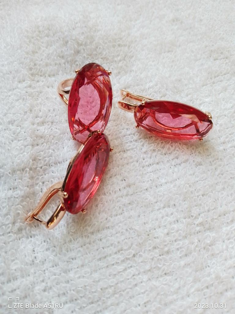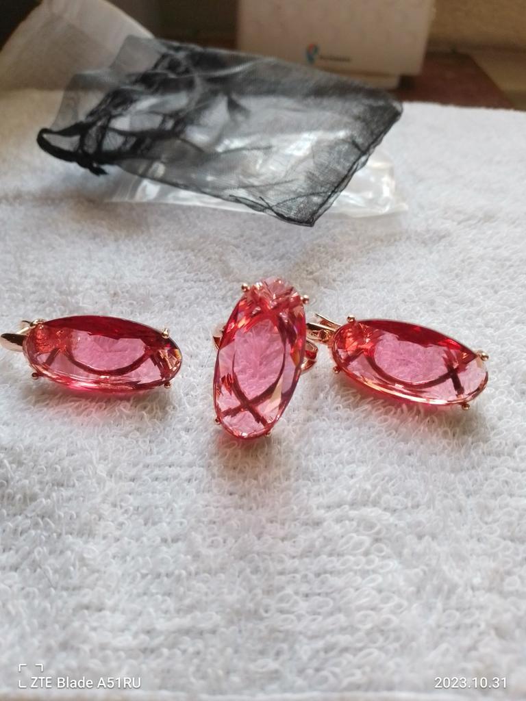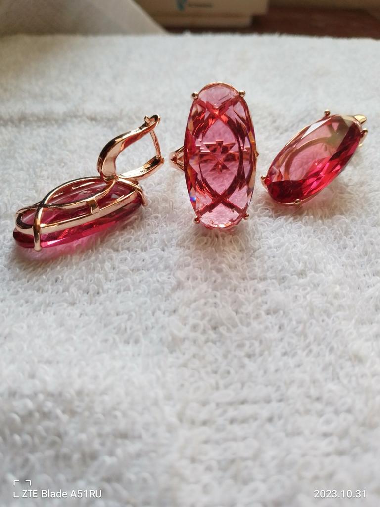 Очень красивый набор, в жизни цвет темнее. Снизила бал за то, что на одной из серёжек замок совсем не держит, хотелось бы за такие деньги качество получше. Кольцо 18 р. подошло на 17.5