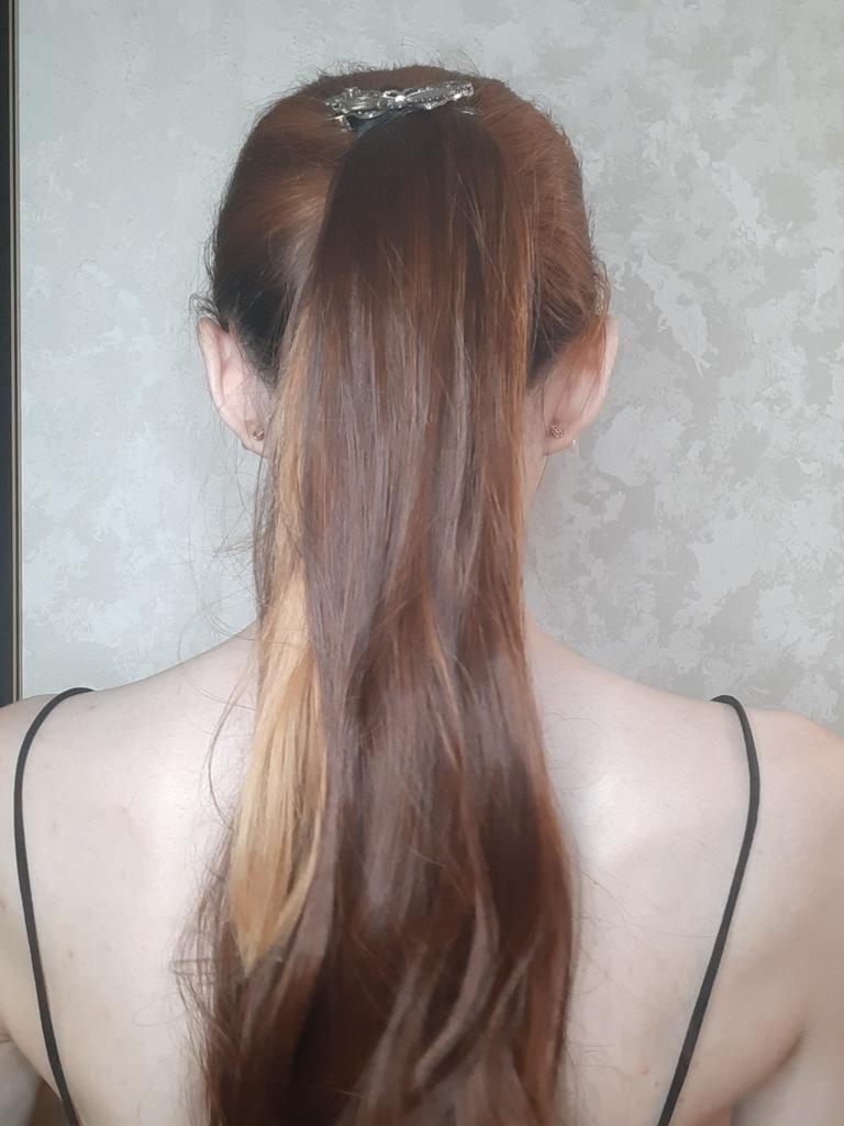 Хвост просто супер не тяжёлый густой , крепиться хорошо я его не чувствую на голове заказывайте не пожалеете спасибо магазину джум и спасибо продавцу Ps сделайте хвосты со светлыми оттенками так как пришлось перекраситься под хвост спасибо