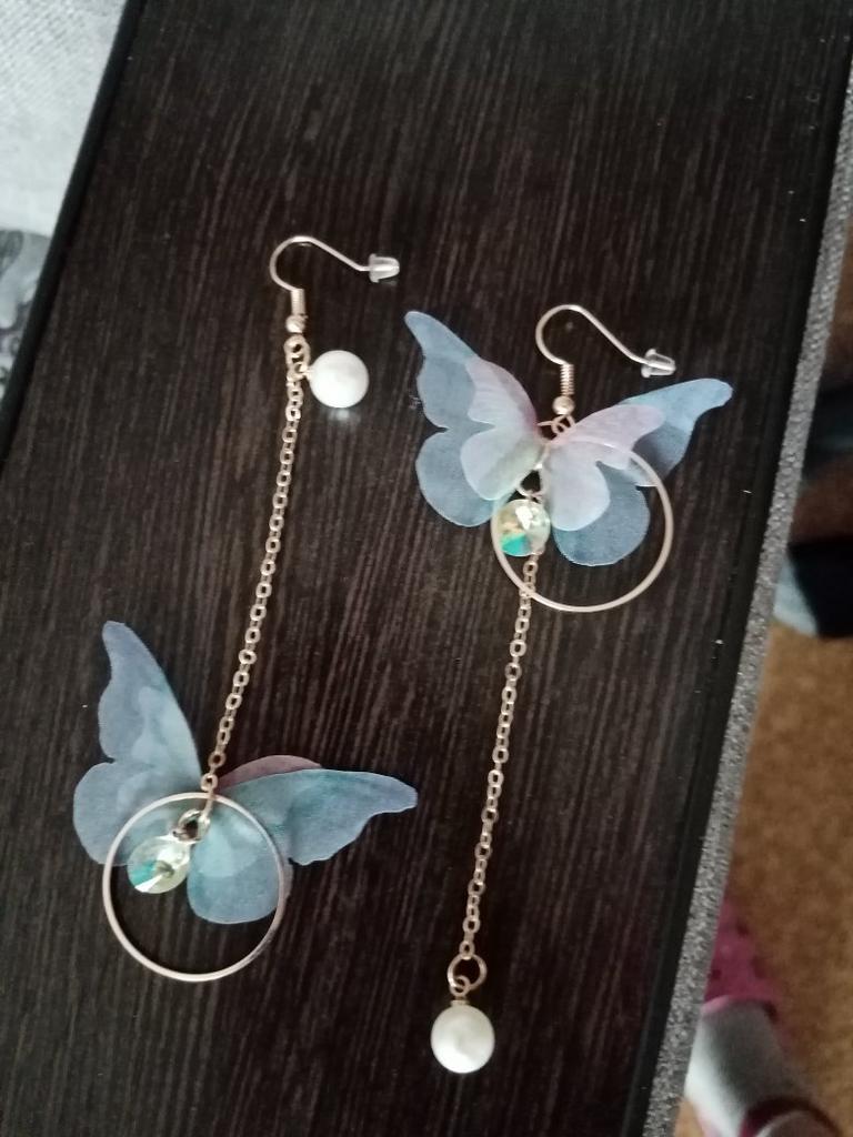 Долетели бабочки!! Очень необычные и красивые серьги, довольно лёгкие, не смотря на длину. Ассиметричные. Смотрятся довольно нежно. Крылья бабочки выполнены из тонкой ткани, но при этом прочной и хорошо держат форму. Упакованы в пузырчатый пакет были, всё целое, в швензе серьги мягкий металл, надеюсь, что не сломаются, ощущения в ушах после них тоже комфортные. Продавцу спасибо и рекомендую! Хочу дополнить отзыв: их замечают все и эти серьги производят впечатление, они практически невесомые, металл не потемнел после 2-х недель носки. Довольна этой покупкой. Отправление шло чуть больше месяца до г.Алматы