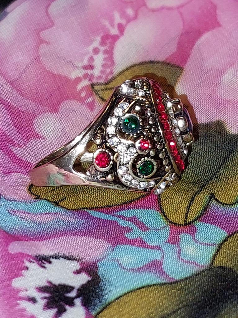 Кольцо пришло очень красивое мне очень нравиться, но с боку камня красного нет с другой стороны нет зеленого камушка смотрела что прислали в пакете думала сама приклею там не было камушек. Очень обидно. Поэтому ставлю 4 звезды. Кольцо красивое но без камушек несмотриться. Очень жаль я растроилась. Ведь кольцо само по себе очень красивое. Спс