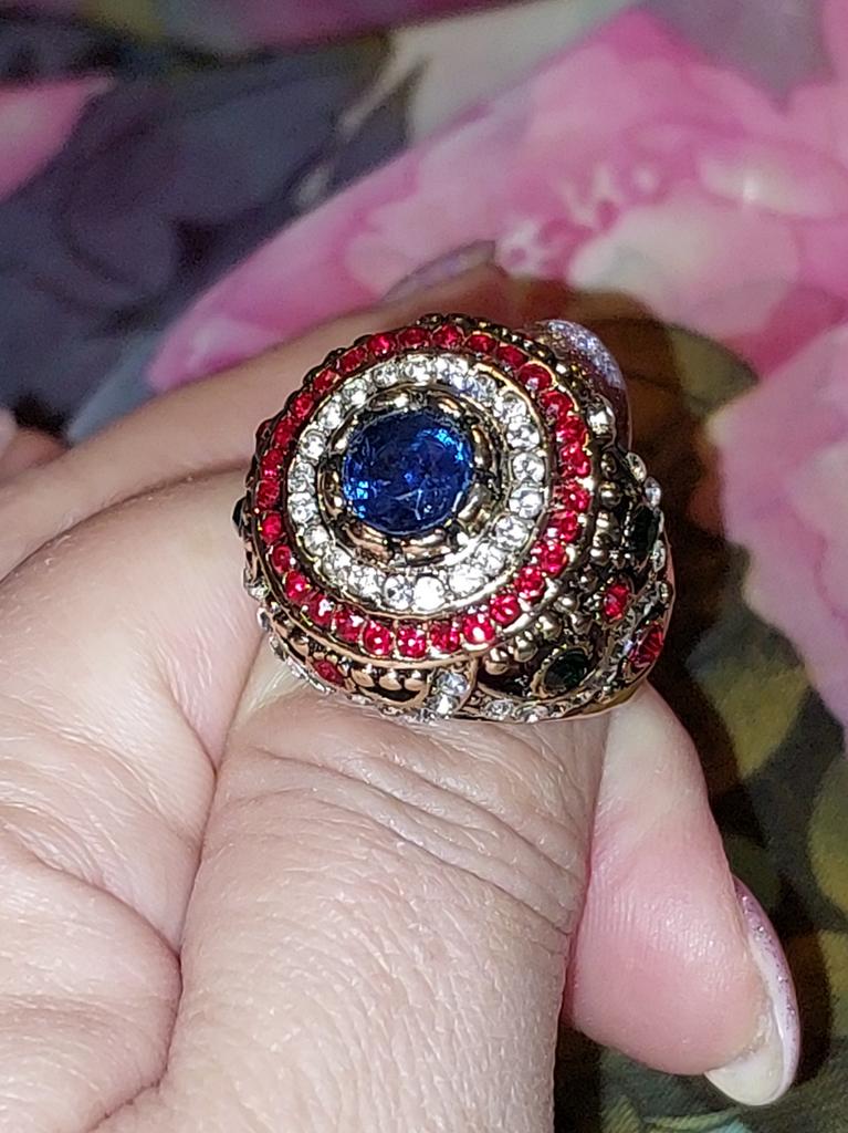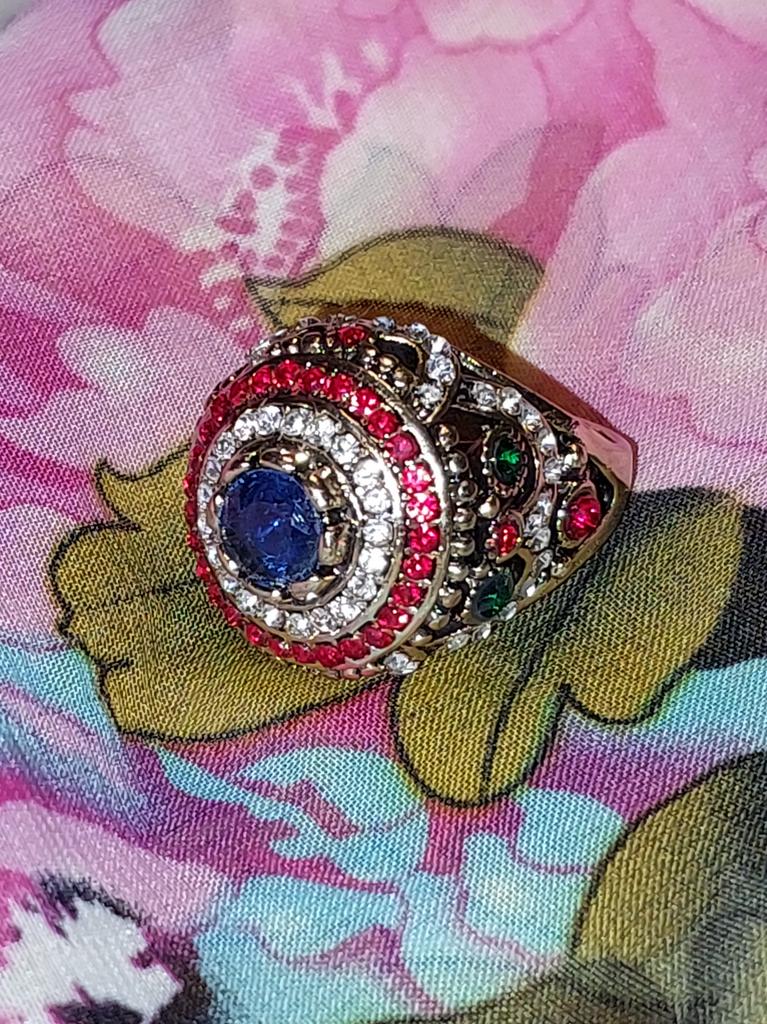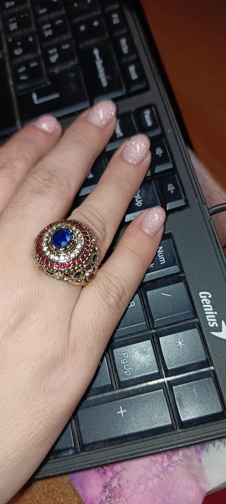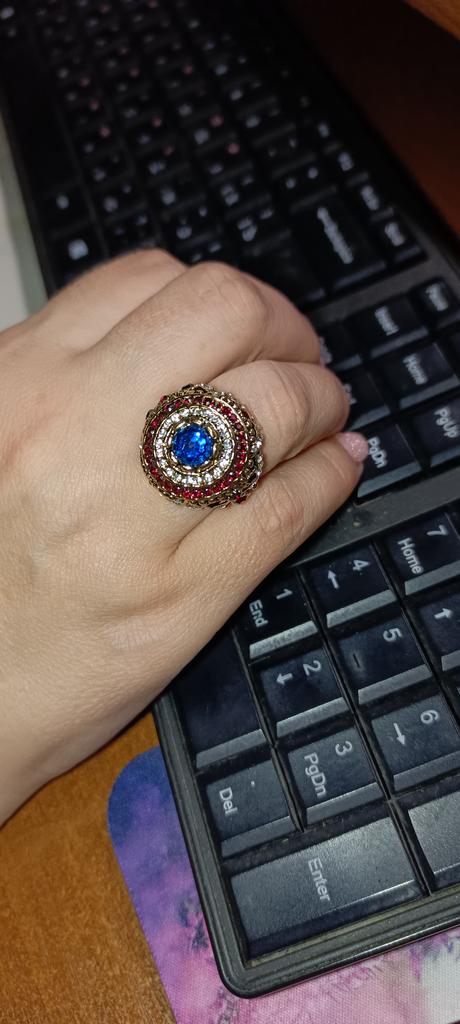 Ну о-очень красивое, эффектное, массивное солидное, яркое, незабываемое кольцо! Царский перстень! С сожалением приходится отметить, что синий камень в серединке, конечно, не камень, и даже не стекло. Это пластик. Все маленькие камушки, скорее всего, приклеены, поэтому есть опасения, что будут потихоньку отпадать. Но пока всё хорошо, буду носить с восторгом и удовольствием. Размеру соответствует. Размер 10 свободно заходит на наш 20. Цвет металла очень приятный. Рекомендую к покупке.