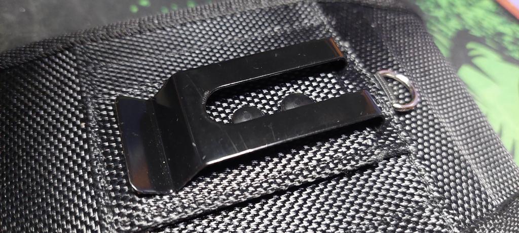 Имеет не только шлейку для ремня (вертикально и горизонтально), но и металлическую прищепку. "Липучки" (текстильной застёжки) хватило на 2 недели. Сейчас приходится её вдавливать с проворотом. Посмотрим, когда она умрёт совсем.