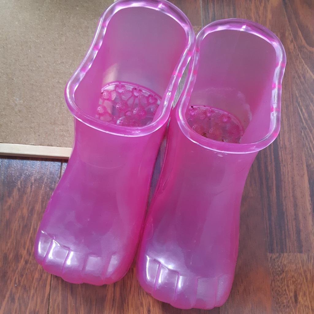 Чудесное изобретение для ножных ванночек! Это вторая покупка ( в первый раз купила синие, в подарок маме). Качество хорошее, есть массажный эффект внутри. Было бы здорово, если сапожки немного увеличить в размере/ либо производить модельки нескольких размеров (на разную ножку). Вода не протекает, тепло сохраняется (но тут важно не переборщить с водичкой: сперва надеть, потом вливать потихонечку). Сапожки, видимо, обработаны антисептиком - уж очень сильный химический запах!