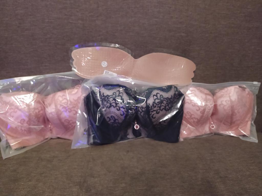 Заказ шел меньше месяца, отслеживался до почтового отделения. Продавец сформировал все в один заказ. Упаковано качественно: большой пакет, внутри индивидуальные упаковки для каждого лота. Каждый бюстгальтер при этом ещё и упакован в свой отдельный застегивающийся пакет с инструкцией на тыльной стороне. Бюстгальтеры полностью соответствуют описанию и заявленным фотографиям. Ощущения: мягкие х/б кружева, резинка не колется. На 6-ой размер больше подходит размер 42/95, хотя 40/90 сидит тоже хорошо, но в 42 "уютнее". На 4-й размер 38/85 сидит отлично. Хорошо " собирают" и держат грудь, широкая застежка поддерживает спину, бретели х/б, отстегиваются, регулируются по высоте. "Штучка на липучке" подходит максимум для третьего размера, на большой груди выглядит комично. Силикон прилипает хорошо, покрытие с внешней стороны приятное на ощупь, не синтетика, гладкое. Спасибо продавцу, все товары качественные.