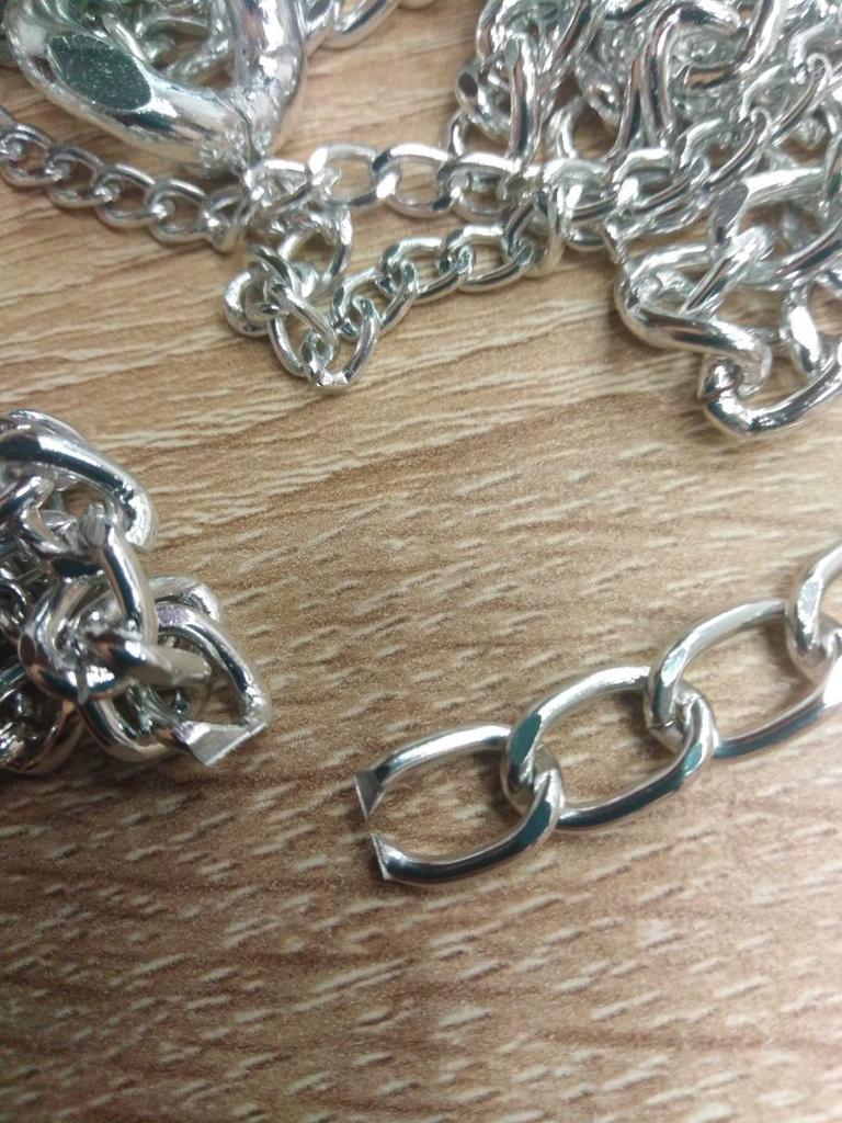 Металл и пластик, покрытый серебряной краской. Покупала эти цепи с идеей украсить сапоги, но пока они шли,купила в магазине другие металлические цепи по приемлемой цене. На это колье взглянула с другой стороны, захотелось его носить на шее, оно хорошо блестит и очень лёгкое. Но!!! Нуждается в доработке. Не хватает (лично мне) удлиняющей цепочки с другой стороны и для симметрии и для того, чтобы само колье было не под шею, а чуть ниже. Справиться с этой задачей мне легко. Присмотритесь, оно в тему тем, кто любит такой стиль. Кстати, можно их повесить на сумку или куртку.