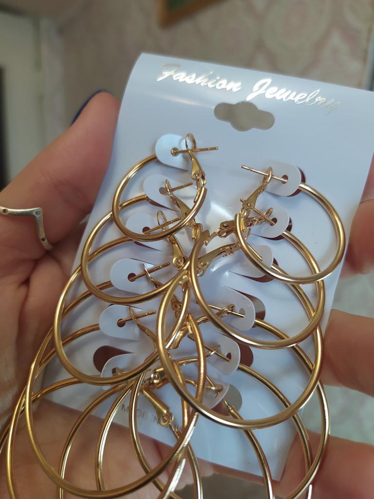 🌟6 "золотых"пар серег за одну скромную цену🌟 ⚡Доставка до Москвы за 3 недели; ⚡Стоимость-170₽. Давно их получила и только руки дошли написать🤗 Хороооошенькие👍 Форма: серьги-конго. Этот набор на тот случай,когда нужен иной, отличный от других, диаметр серег под индивидуальный образ. Тут 6 пар. Диаметр серег: 25,30,35,40,45,50мм. На мне,на фото, самые большие -50мм. Сплав,но очень качественный.Не гнутся, крепкие и хорошо держат форму. Застёжка с нахлестом-рабочая,без брака абсолютно на всех модельных размерах. Цвет идентичный золоту. Не облазит, идеально все прокрашено. Набором конечно брать выгоднее.Пара выходит за 28-30₽-это смешные деньги в наше время, а вариаций с размерами аксессуара уйма. Я очень рекомендую,отличное качество за такие скромные деньги👍Серьги-конго никогда из моды не выйдут и они актуальны практически в любом образе будь то хоть классика,хоть спорт,хоть casual. Всем добра и хороших покупок!🤗😎😍✌