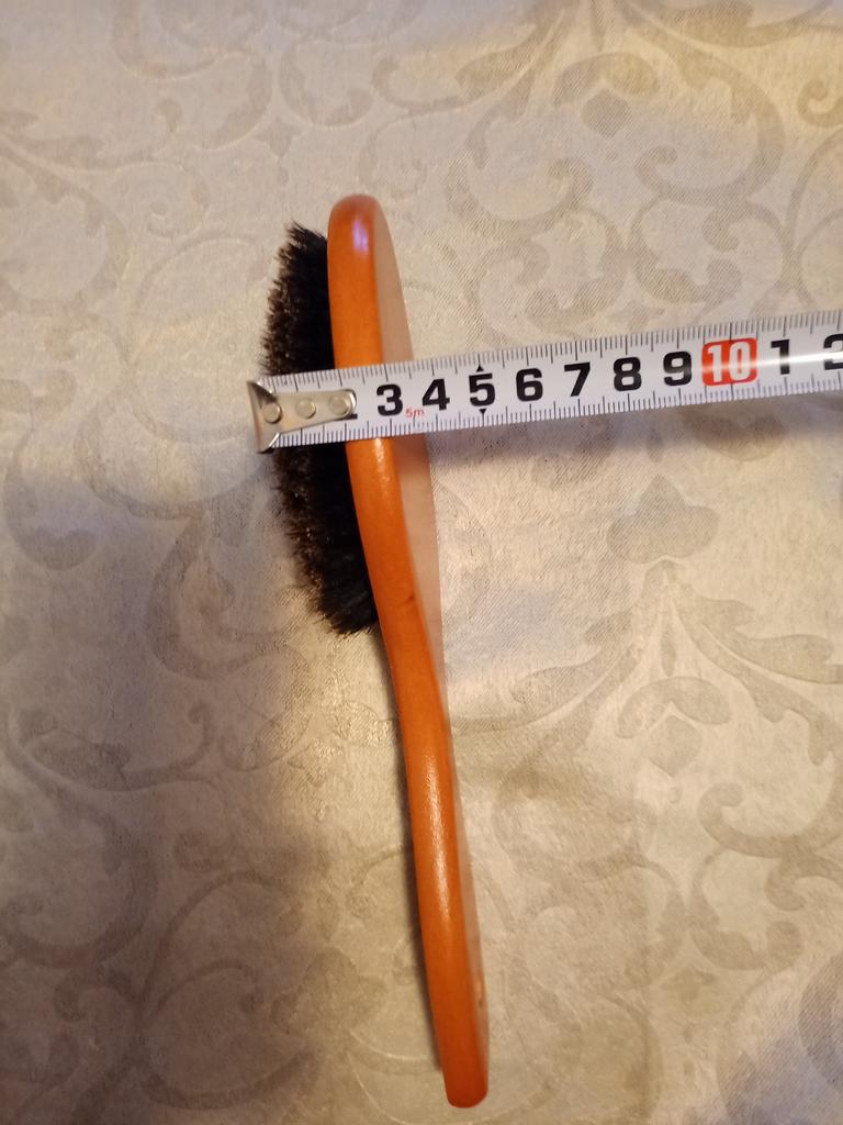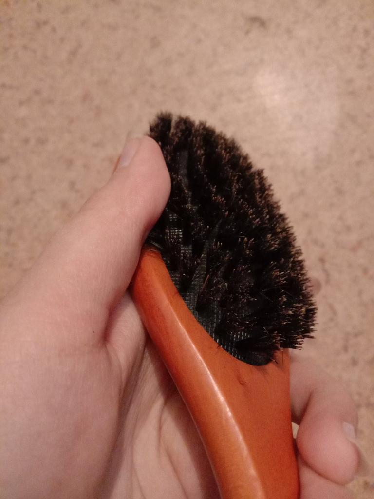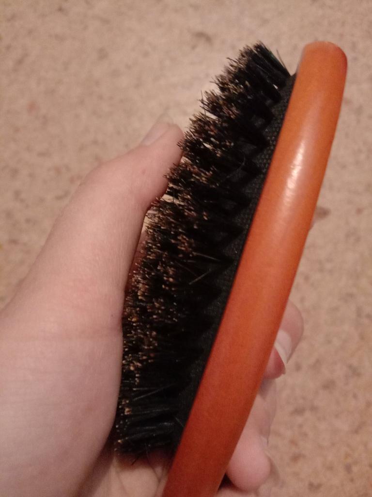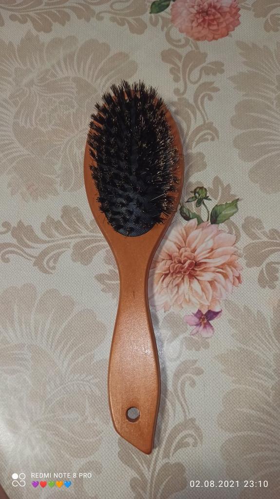 Вот такая вот расческа. В магазине было сказано, что щетина натуральная, как оценить не знаю. Основа из дерева, покрытая лаком, сами же щетины жестковатые и относительно мягкие одновременно. От щетин исходит какой-то запах, какого нет у основы. Расчесывает довольно хорошо и приносит очень много приятных и массажных ощущений, которых нет у обычных пластмассовых массажек. Очень лёгкая и удобно лежит в руке. Кожу головы совсем не царапает. Мне нравится! Никогда такой не пользовалась, но от учителя парикмахера слышала, что пользование такими щетками, придаст волосам приятный и здоровый блеск. Будем проверять :> Оценка 5 из 5✨