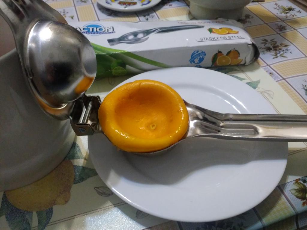 Грубая штамповка из тонкого железа. Как пресс для отжима сока лимона и тем более апельсина не годится из-за слишком малого размера чаши (5см). На фото небольшой лимон d=5,5см, из пол-лимона получил чайную ложку сока. Своих денег не стоит, к покупке не советую!