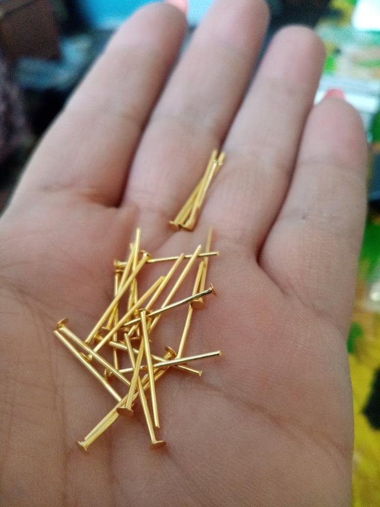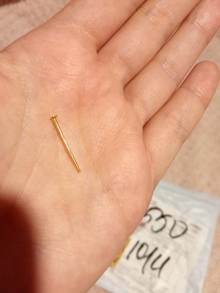 Очень долго искала пины именно золотого цвета и даже на джуме нашла у одного единственного продавца.пины хорошие,шляпка довольно крупная и тонкая.стержень тоже то что надо и не тонкий и не толстый.не сломается при формировании петельки.металл в меру мягкий не придется вызывать Шварценеггера при работе с ними.сколько их там в пакетике не считала,но визуально много.получила на почте по смс