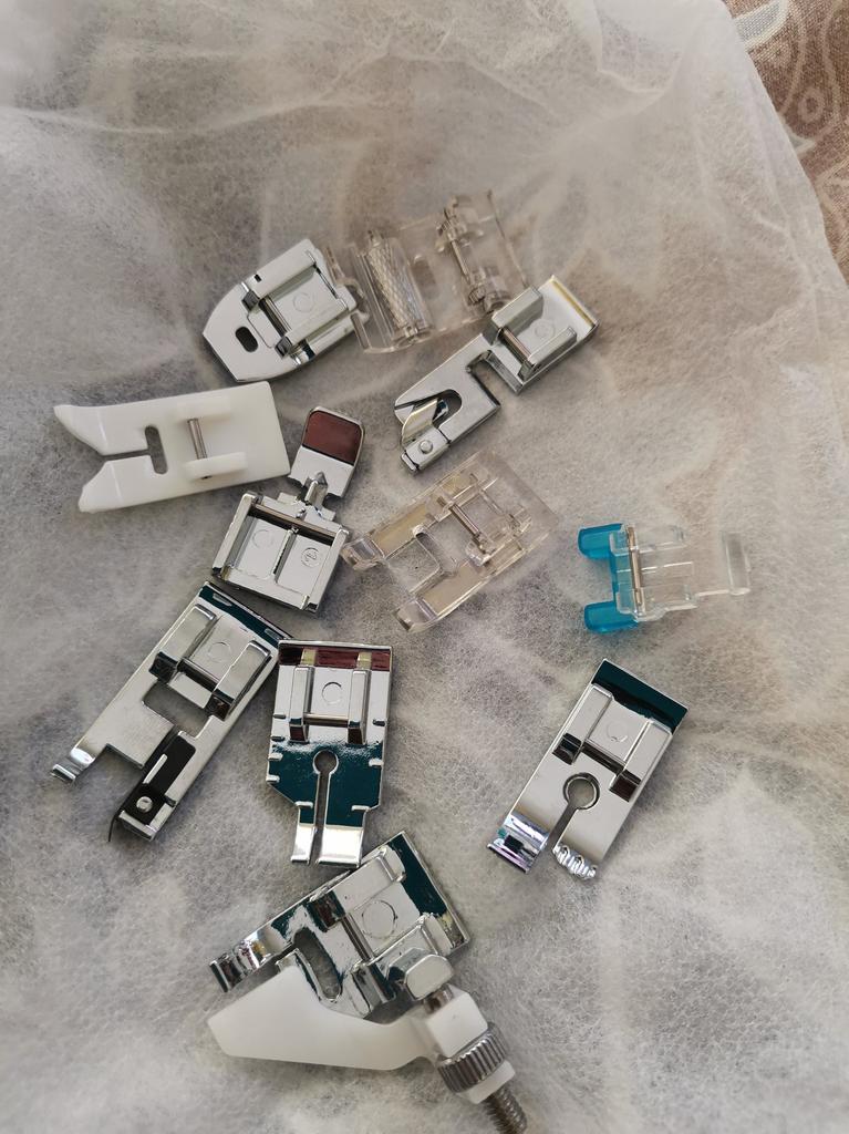 Набор лапок для швейной машины из 11 штук. Лапки хорошего качества. Коротко распишу каждую. 1- для пришивания обычной молнии 2- для пришивания потайной молнии 3- для прямой строчки 4- для прямой строчки 5- обычная лапка 6- обычная лапка 7- для пришивания пуговиц 8- для пошива кожи и экокожи с вращающимся валиком 9- оверлочная лапка с направителем по краю ткани 10- для под гибки края тонких тканей 11- для ровной строчки с регулировкой ширины отстрочки. Очень хороший обзор на все лапки у Марины Гусевой.