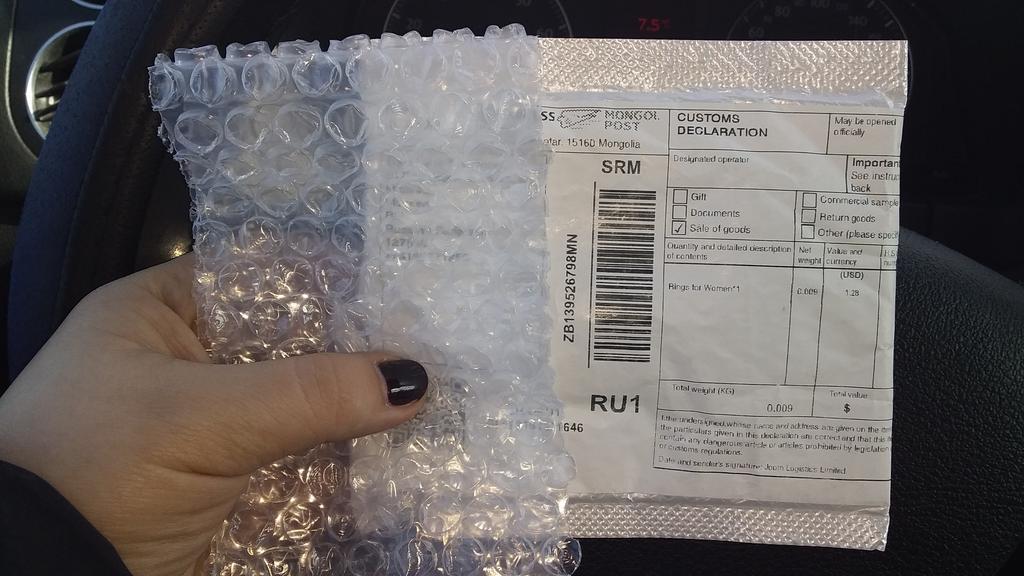 Заказ дошел до Москвы ровно за месяц. Отслеживался частично: начальная точка-Китай и конечная - отделение почты по месту жительства. На картинке камень выглядит более насыщенным и темнее чем на самом деле. Но и такой цвет очень интерессно смотрится. Упаковка: Первичная (пакет с полосой-клипсой), вторичная пакет с "пупырками".+ дополнительный слой "пупырок", намотанный на первичный пакет. Один минус, что размер пришел не тот, который заказывала.Очень жаль. Дополняю: При жалобе на доставку товара не того размера, мгновенная реакция операторов, и в течении 3х минут статус заказа "Отменен" и сообщение о возврате средств в течение 13 дней. Через 2 дня после подачи заявления, вернулись деньги на карту. СПАСИБО ДЖУМ!!!