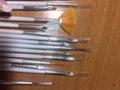 Шло долго, пришло вместе с другим заказом, задержалось. Упаковка не очень, часть кистей в чехлах-замяты, как и чехлы. Основание металлическое у кистей в чем-то за охнем измазано, на одной из кистей аж налипли волосинки от другой( видео на фото). Кисти плоские веерные имеют вылезшие волосинки. Дома для непрофи поиграться- будет норм)