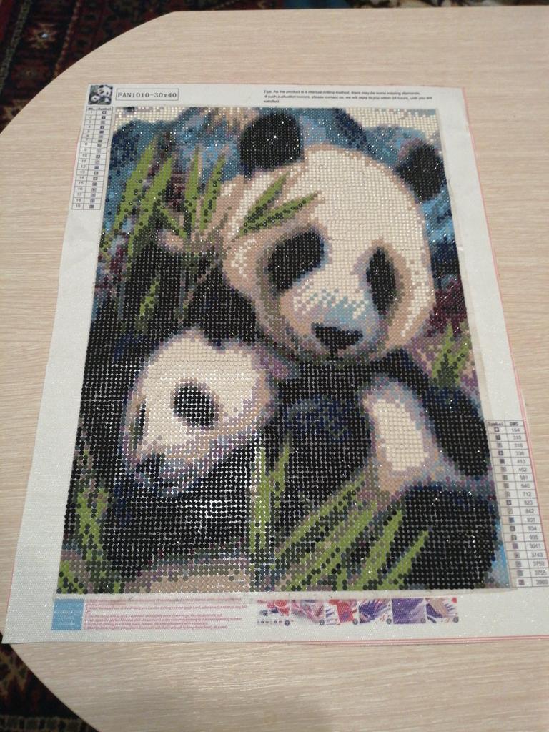 Получила вторую такую картину,первую подарила соседке,помогала выкладывать мои, когда я лечила зрение. Получилась хорошая, но продавцу нужна доработка ,добавить алмазы белого цвета и зеленого поярче, т.к на картине зелень сочная и панда белее и картина будет эфектней, ярче. Может найду в остатках от других картин ,есть сомнение, что столько по количеству не будет ,но все равно спасибо.