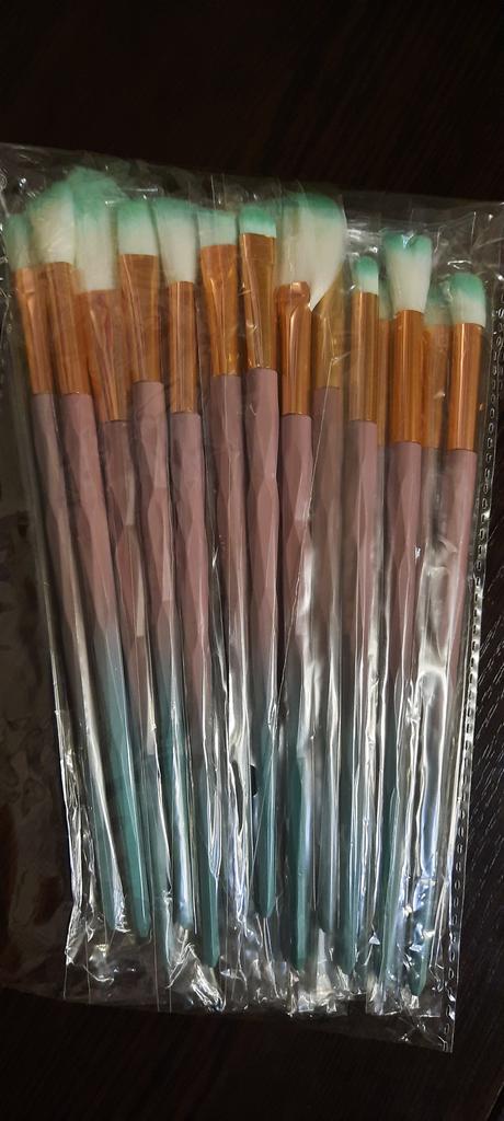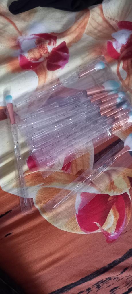 кисти пришли относительно быстро. отслеживались. каждая упакована в отдельную упаковку. 9 из 20 кистей линяют очень сильно. в основном пушистые кисти для растушевки. блёстки на ручках совершенно другие, как и сами ручки. плотно набить кисти достаточно хороши для нанесения теней и блесток. так же плоские кисти для помад идеальны. для бровей кисти слишком толстые, а для рисования стрелок кисточка линяет и волоски откланяются.