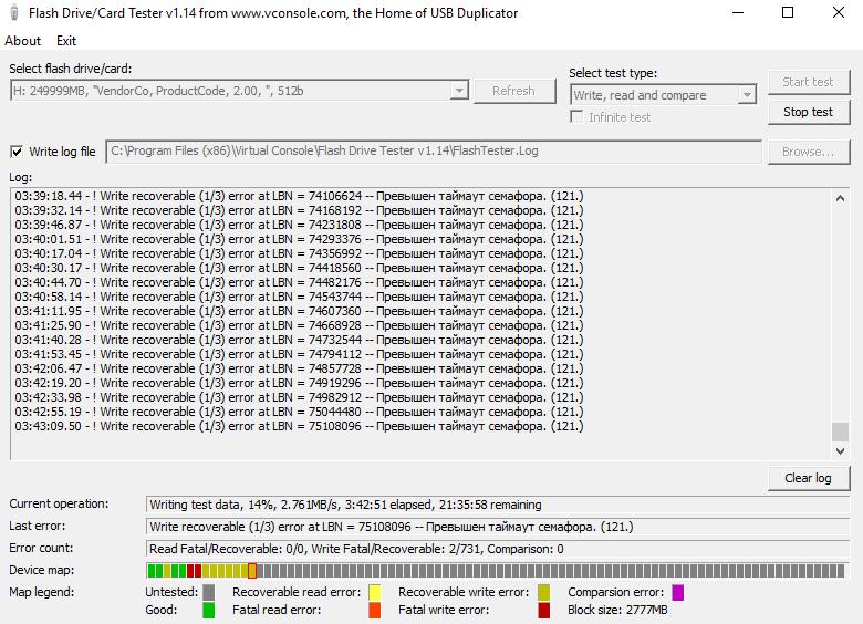 Шёл в Минск месяц. Флешки работали, но со сбоями. Отдала тестировщикам, сказали что формат не совпадает раз в 10, буду разбираться. Работают на очень маленькой скорости и со сбоями. Хочу протестировать сама, если и дальше так будет, то хотелось бы вернуть деньги. Проверю, напишу. Протестировала 2 мя программами. Тестирование флешки 1 Error creating file 'H:\1.h2w'. (Файл или папка повреждены. Чтение невозможно. Code 1392) Warning: Only 100 of 249991 MByte tested. Writing speed: 0.00 KByte/s H2testw v1.4 Тестирование флешки 2 Warning: Only 100 of 249990 MByte tested. The media is likely to be defective. 33 MByte OK (67584 sectors) 67 MByte DATA LOST (137216 sectors) Details:67 MByte overwritten (137216 sectors) 0 KByte slightly changed (< 8 bit/sector, 0 sectors) 0 KByte corrupted (0 sectors) 33 MByte aliased memory (67584 sectors) First error at offset: 0x0000000000000000 Expected: 0x0000000000000000 Found: 0x0000000006300000 H2testw version 1.3 Writing speed: 2.84 MByte/s Reading speed: 7.64 MByte/s H2testw v1.4 Тесты показывают то что около 70% секторов нуждаются в восстановлении, то что в действительности и происходит, вы записываете информацию а она может читаться а может нет. Причём если сразу, то флешка работает нормально но очень медленно, но со временем история информации непредсказуема. Товар не качественный. Хотелось бы вернуть деньги и купить что то надёжнее. Написала в службу поддержки, обещали вернуть деньги. Благодарю Джум, деньги вернули.